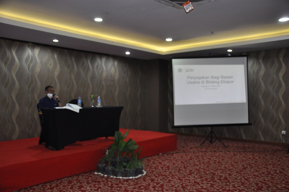 Fungsional Penyuluh Kantor Pelayanan Pajak (KPP) Pratama Yogyakarta menjadi narasumber kegiatan sosialisasi bertajuk Sosialisasi Aspek Perpajakan Ekspor kepada Industri Kecil Menengah (IKM) di Yogyakarta (Kamis, 17/3).