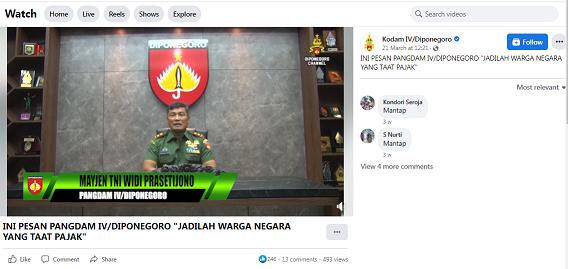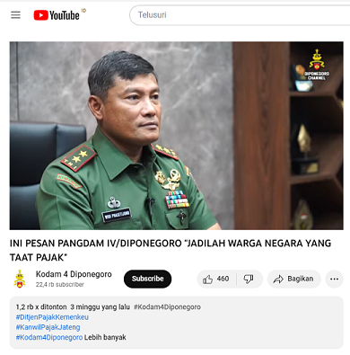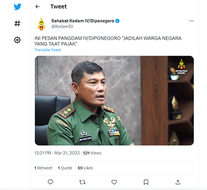 Mayor Jenderal Tentara Nasional Indonesia (TNI) Widi Prasetijono, Panglima Komando Daerah IV/Diponegoro telah melakukan pemadanan NIK menjadi NPWP dan juga menyampaikan SPT Tahunan Tahun Pajak 2022 melalui laman www.pajak.go.id. Hal tersebut diungkapkan dalam video yang diunggah oleh akun Instagram Komando Daerah Militer (Kodam) IV/Diponegoro @kodam_diponegoro (Selasa, 21/3). Video serupa juga diunggah Kodam IV/Diponegoro di berbagai media sosial seperti Youtube, Twitter dan juga Facebook.