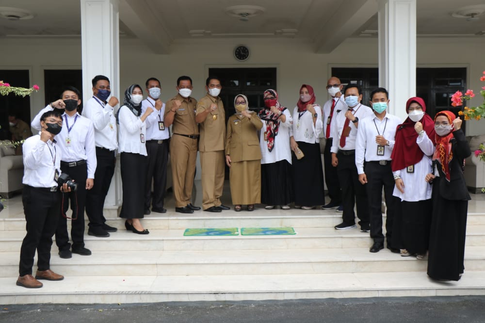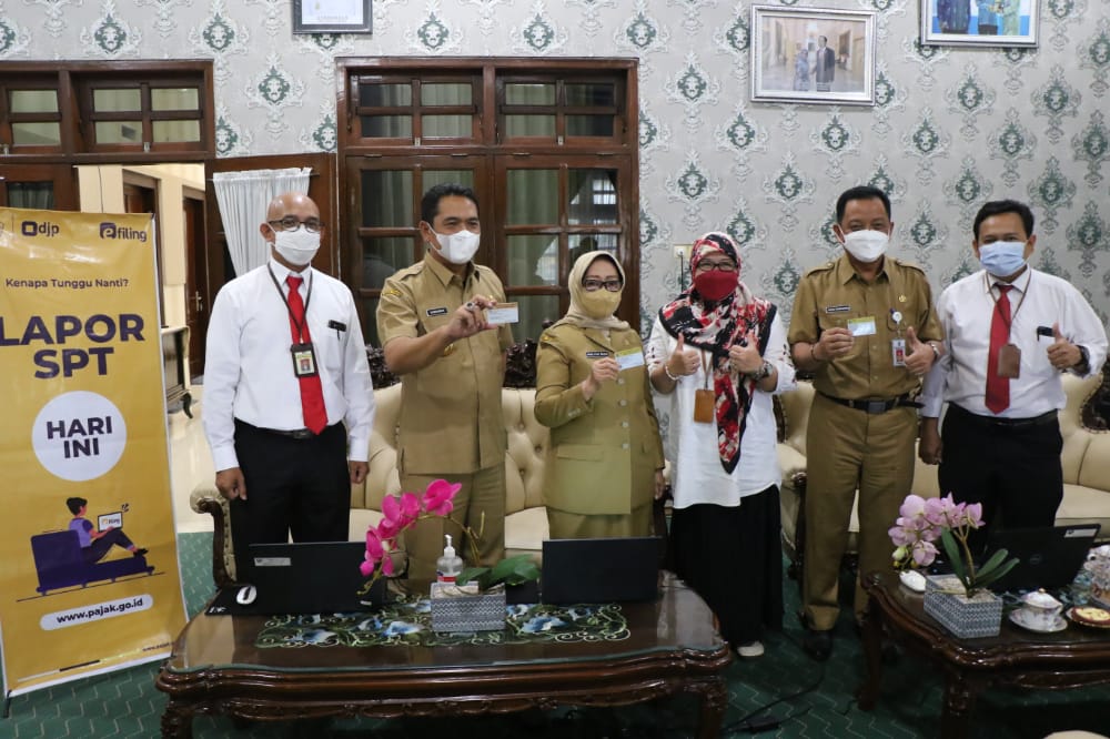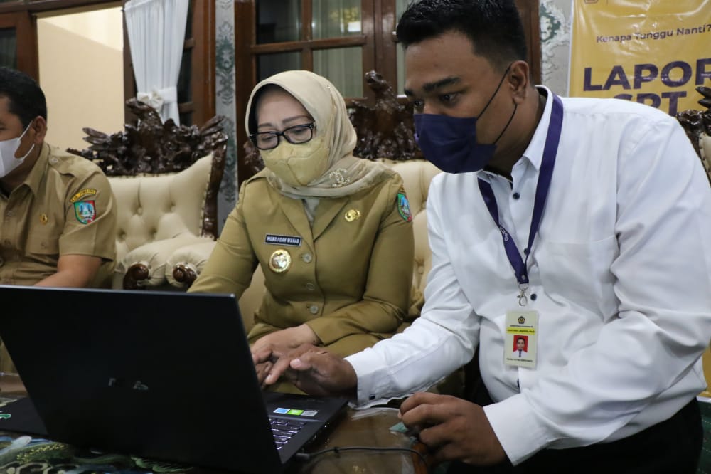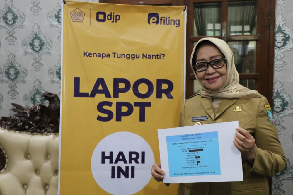 Bupati Jombang Mundjidah Wahab bersama dengan Wakil Bupati Jombang Sumrambah dan Sekretaris Daerah Kabupaten Jombang Agus Purnomo melakukan pengisian dan pelaporan SPT Tahunan PPh Orang Pribadi tahun 2021 melalui e-Filing di Pendopo Kabupaten Jombang (Senin, 7/3).