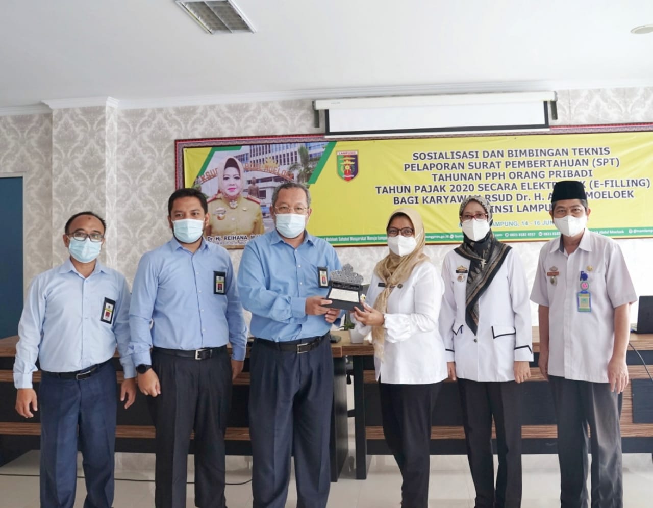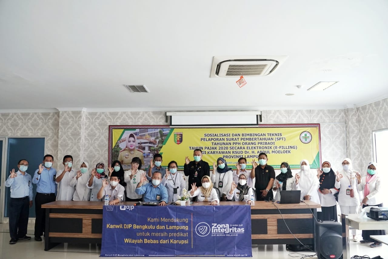 Kantor Wilayah Direktorat Jenderal Pajak (Kanwil DJP) Bengkulu dan Lampung bekerja sama dengan Bidang Sumber Daya Manusia (SDM), Pengembangan, Pendidikan dan Hukum Rumah Sakit Umum Daerah (RSUD) Abdoel Moeloek mengadakan bimbingan teknis (bimtek) bertempat di Aula Rumah Sakit Abdul Muluk, Bandar Lampung (Senin, 14/6). Peserta kegiatan terdiri dari para dokter, bidan, perawat, serta pegawai bagian keuangan RSUD Abdoel Moeloek.