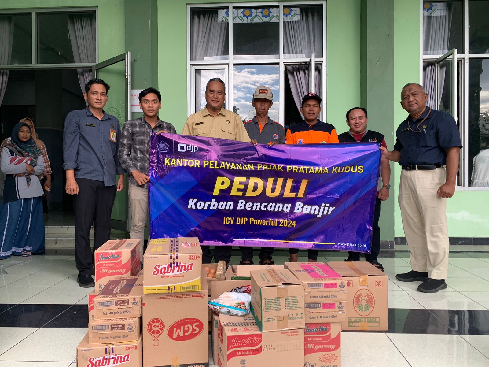 Bantuan ini diserahkan langsung oleh M. Andi Setijo Nugroho Kepala KPP Pratama Kudus kepada Badan Penanggulangan Bencana Daerah Kab. Kudus di Gedung JHK Kab. Kudus. Menurut Badan Penanggulangan Bencana Daerah Kab. Kudus terdapat sekitar 800 jiwa pengungsi di gedung JHK Kudus, mayoritas dari warga sekitar karanganyar yang terdampak langsung oleh banjir. Hujan deras selama satu minggu dan jebolnya tanggul sungai wulan menjadi penyebab utama banjir di wilayah Kecamatan Karanganyar Kabupaten Demak.