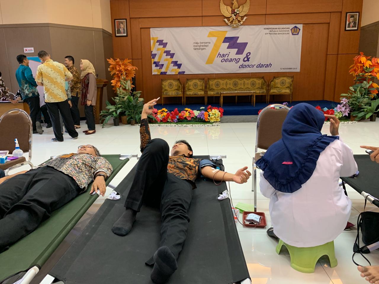 Bekerja sama dengan PMI Bangkalan, KPP Pratama Bangkalan menggelar aksi donor darah yang melibatkan pegawai dan karyawan di lingkungan KPP Pratama Bangkalan bertempat di aula kantor, Bangkalan (Selasa, 12/11).
