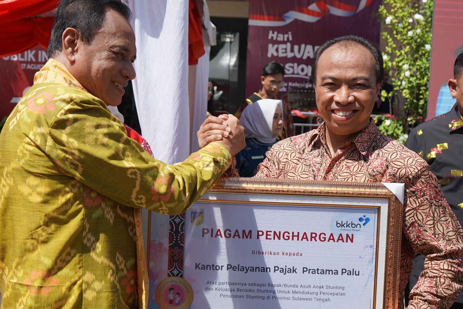 Kantor Pelayanan Pajak (KPP) Pratama Palu menerima apresiasi dan penghargaan atas partisipasi menjadi Kakak, Bapak, dan Bunda Asuh Anak Stunting dan Keluarga Berisiko Stunting (BAAS) se-Provinsi Sulawesi Tengah bertempat di Aula Badan Kependudukan dan Keluarga Berencana Nasional (BKKBN) Kota Palu, Sulawesi Tengah (Kamis, 10/8).