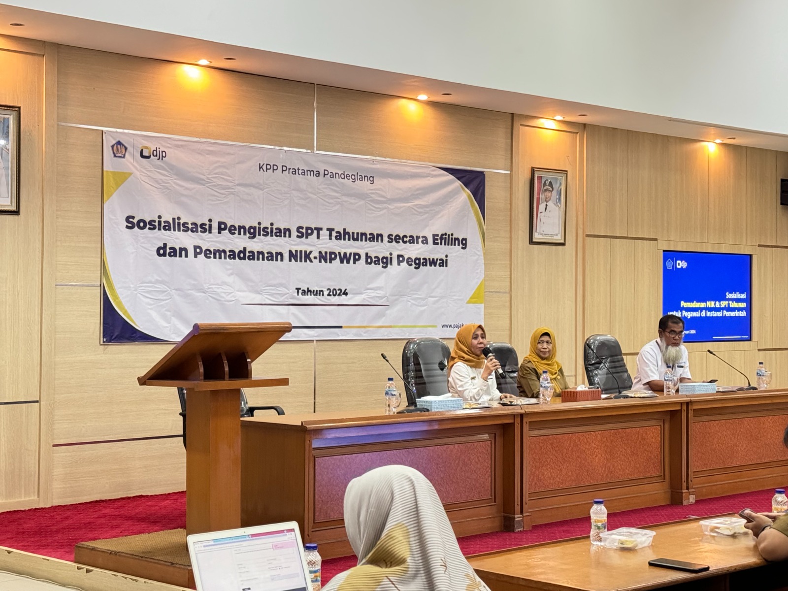 Kantor Pelayanan Pajak (KPP) Pratama Pandeglang bekerja sama dengan Sekretariat Daerah (Setda) Pandeglang menyelenggarakan kegiatan Asistensi Pelaporan Surat Pemberitahuan (SPT) Tahunan melalui e-Filing dalam program One Stop Tax Service yang bertajuk “Ngisi SPT Bebarengan” bagi para pegawai di lingkungan Sekretariat Daerah Pandeglang (Senin, 29/1). Kegiatan asistensi SPT Tahunan di Setda Pandeglang ini berlangsung dari tanggal 29 Februari hingga 1 Maret 2024.