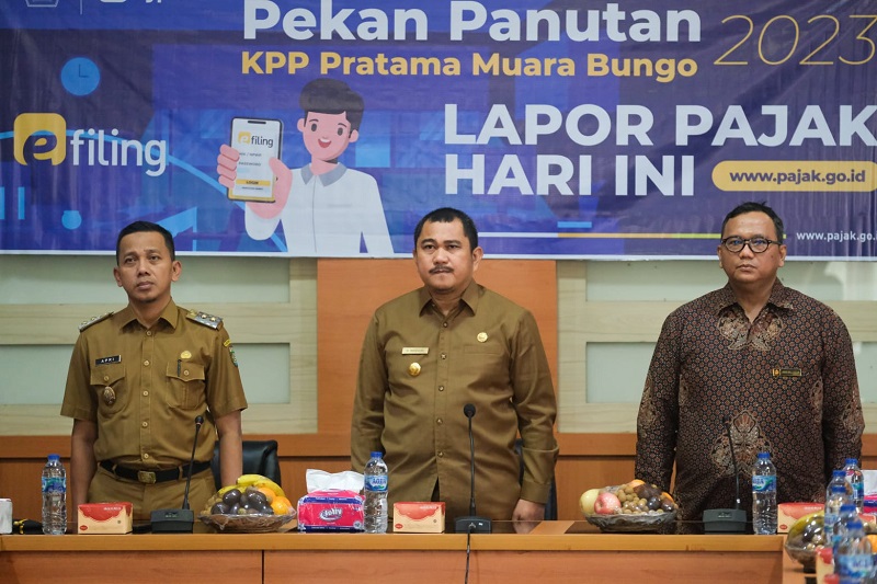 Kantor Pelayanan Pajak (KPP) Pratama Muara Bungo, bekerja sama dengan Kantor Pelayanan, Penyuluhan, dan Konsultasi Perpajakan (KP2KP) Rimbo Bujang dan KP2KP Muara Tebo, menyelenggarakan pekan panutan untuk Pejabat Daerah Kabupaten Bungo di Ruang Utama Kantor Bupati Bungo (Senin, 20/2). Pekan panutan ini dihadiri oleh Bupati serta wakilnya, Ketua DPRD, Kapolres Bungo, Dandim Bungo Tebo, dan Para Pejabat Dinas Daerah.