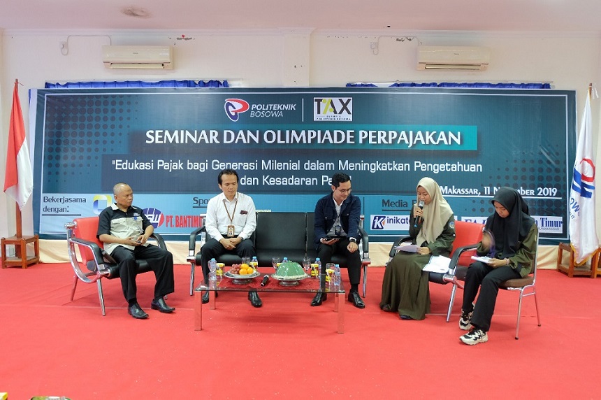 Kanwil DJP Sulawesi Selatan, Barat, dan Tenggara (Sulselbartra) berkerja sama dengan Politeknik Bosowa Makassar mengadakan kegiatan Seminar Perpajakan dan Olimpiade Pajak yang dilangsungkan di Aula Politeknik Bosowa, Makassar (Senin, 11/11). Acara ini diikuti oleh perwakilan pelajar dari SMA/SMK di lingkungan Kota Makassar dan sekitarnya sebagai peserta.