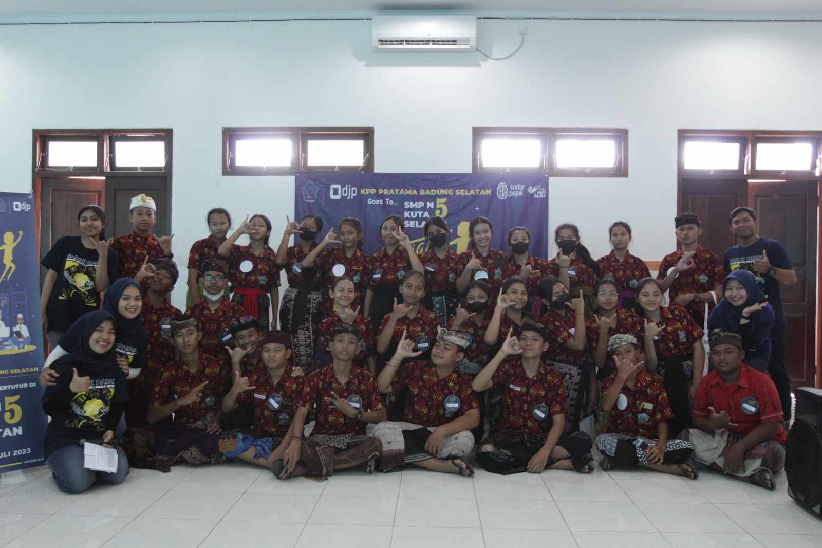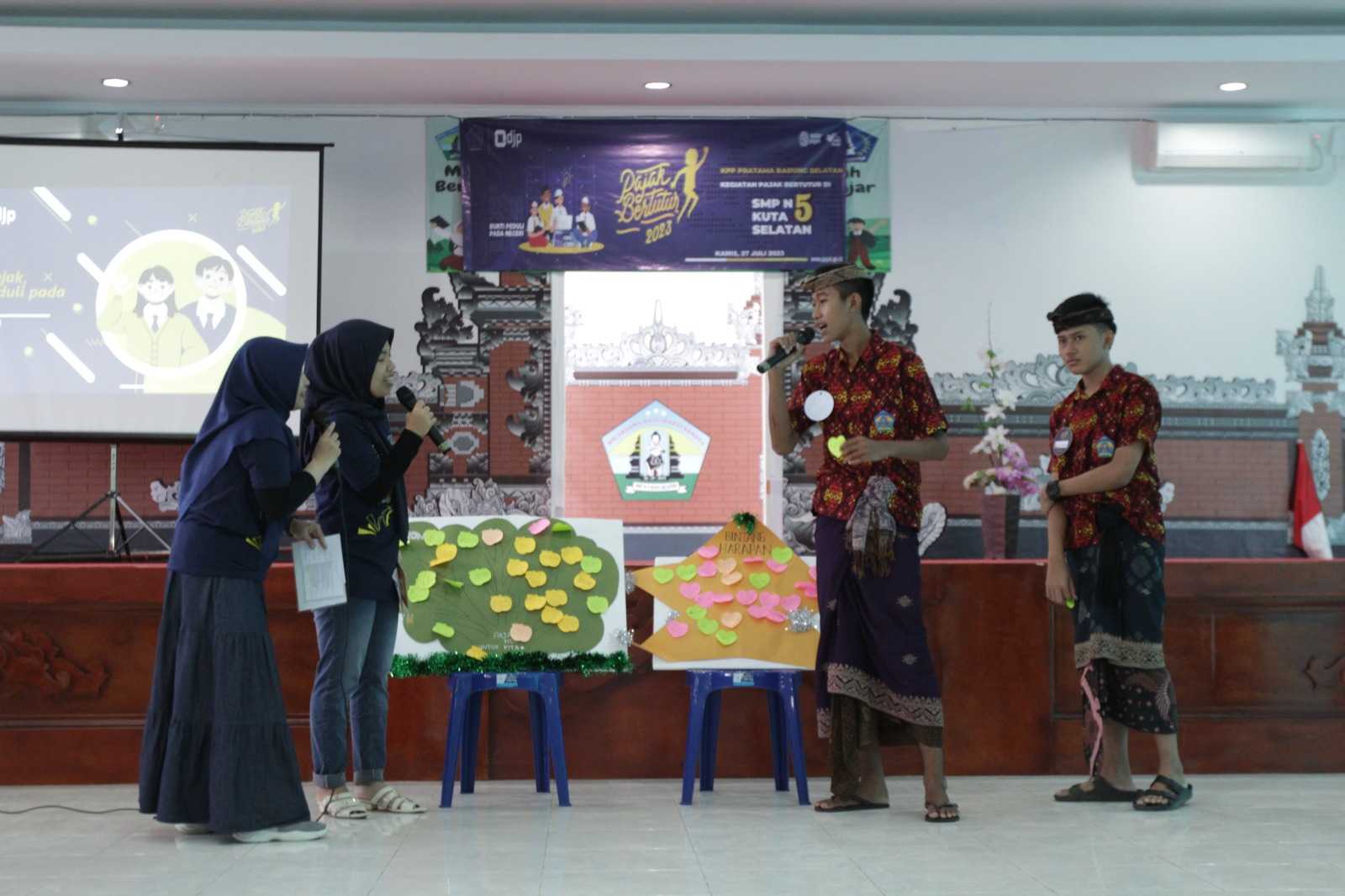 Kantor Pelayanan Pajak (KPP) Pratama Badung Selatan melakukan kegiatan Pajak Bertutur kepada siswa Sekolah Menengah Pertama (SMP) 5 Kuta Selatan. Kegiatan ini diikuti oleh 35 siswa dan 10 orang guru yang bertempat di Aula SMP 5 Kuta Selatan, Kecamatan Kuta Selatan, Badung (Kamis, 27/7).