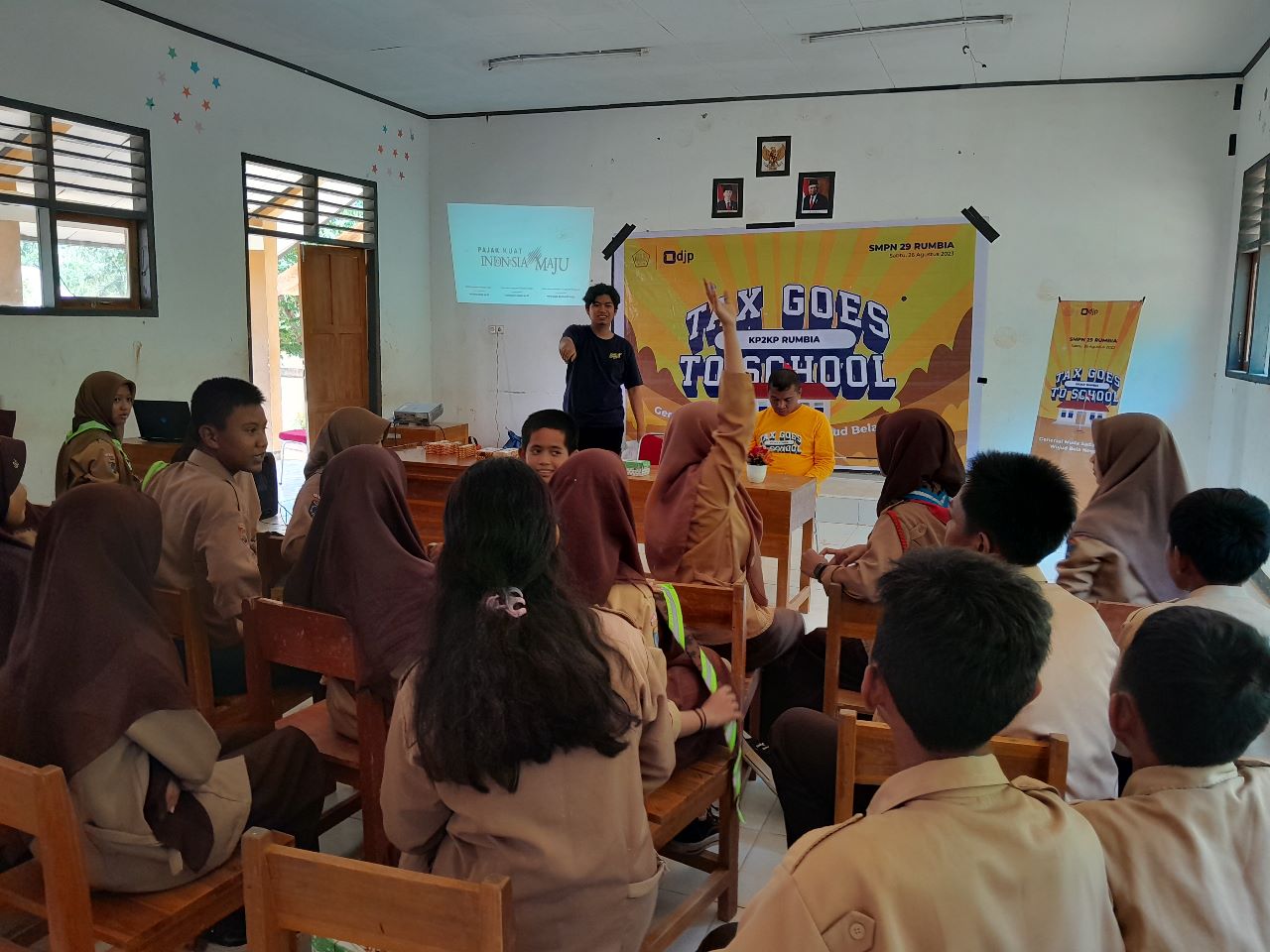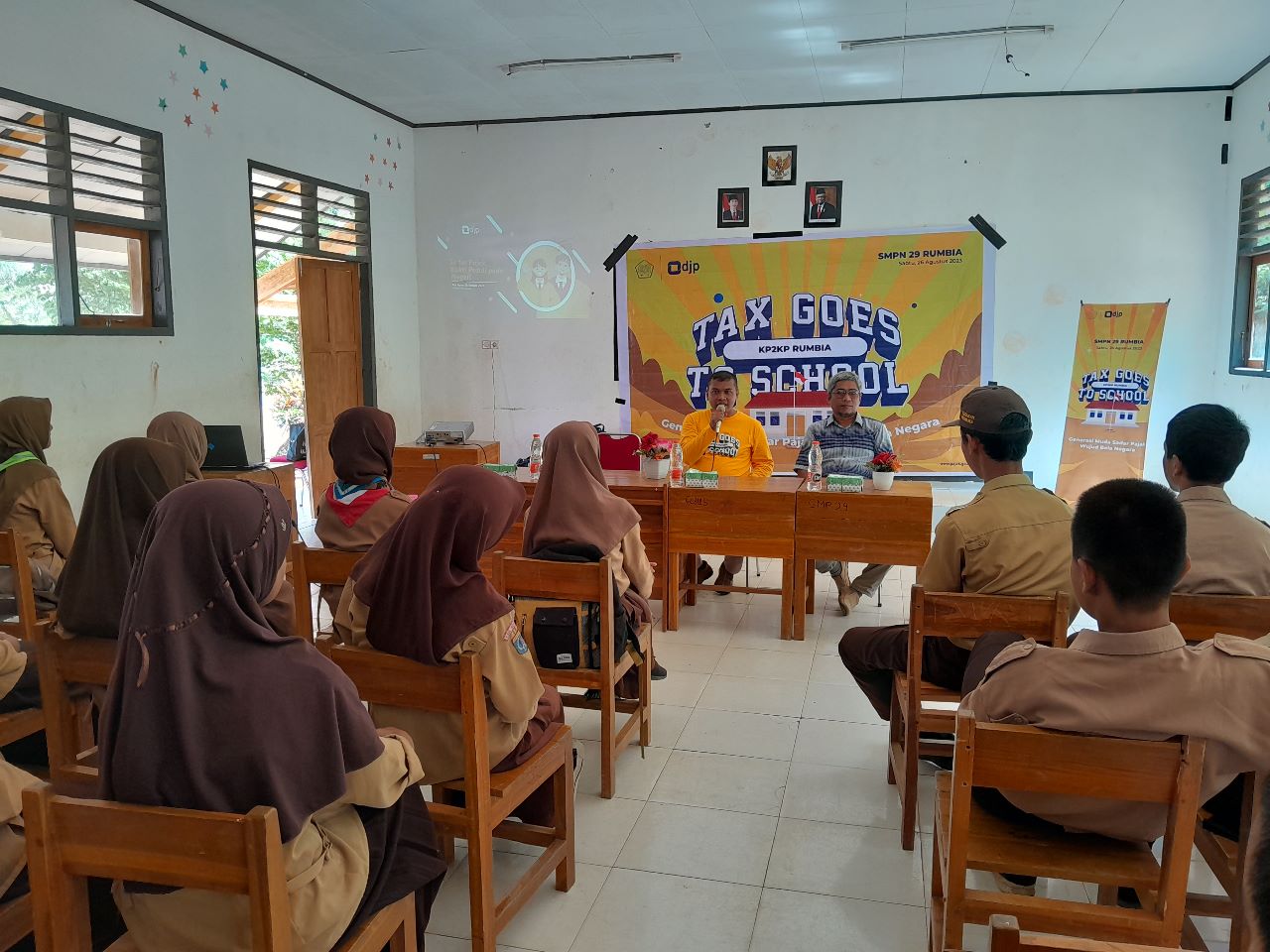 Kantor Pelayanan, Penyuluhan, dan Konsultasi Perpajakan (KP2KP) Rumbia menyelenggarakan Tax Goes To School di Aula Sekolah Menengah Pertama Negeri (SMPN) 29 Rumbia di Kabupaten Bombana, Provinsi Sulawesi Tenggara (Sabtu, 26/8).