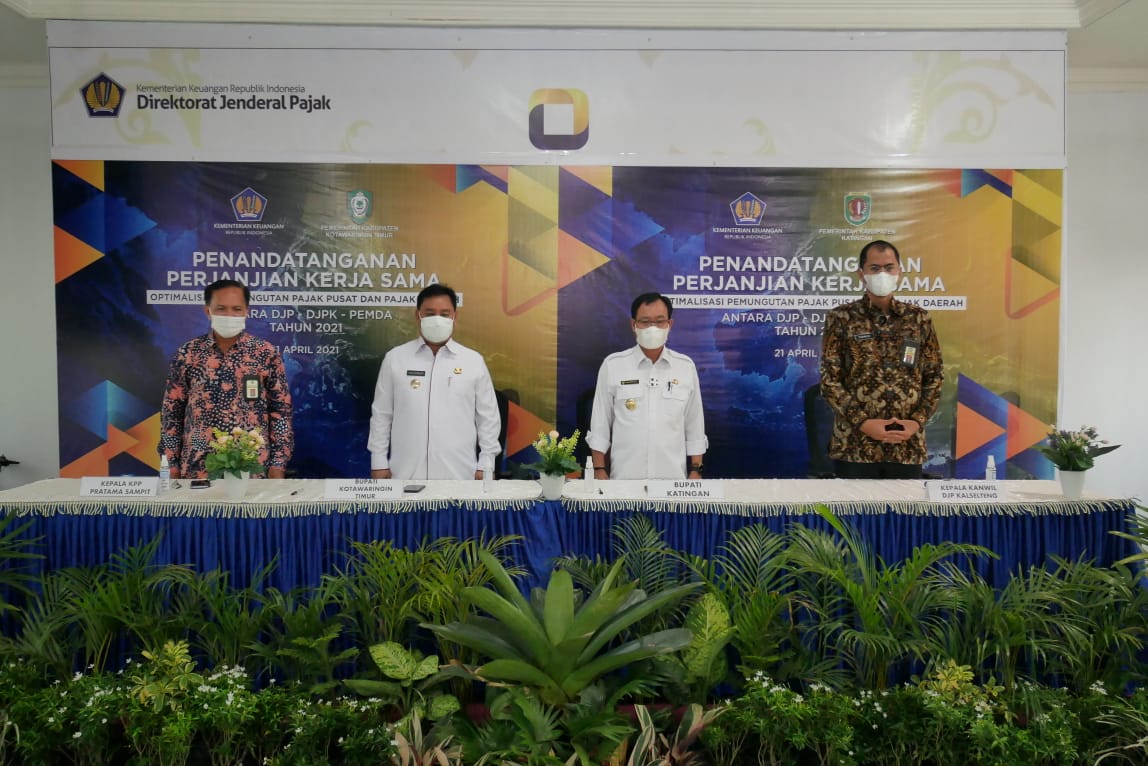 Pemerintah Kabupaten Katingan dan Pemerintah Kabupaten Kotawaringin Timur melaksanakan penandatanganan Perjanjian Kerja Sama (PKS) tentang Optimalisasi Pemungutan Pajak Pusat dan Pajak Daerah bersama Direktorat Jenderal Pajak (DJP) dan Direktorat Perimbangan Keuangan Kementerian Keuangan (DJPK) di Aula Kantor Pelayanan Pajak (KPP) Pratama Sampit (Rabu, 21/4).