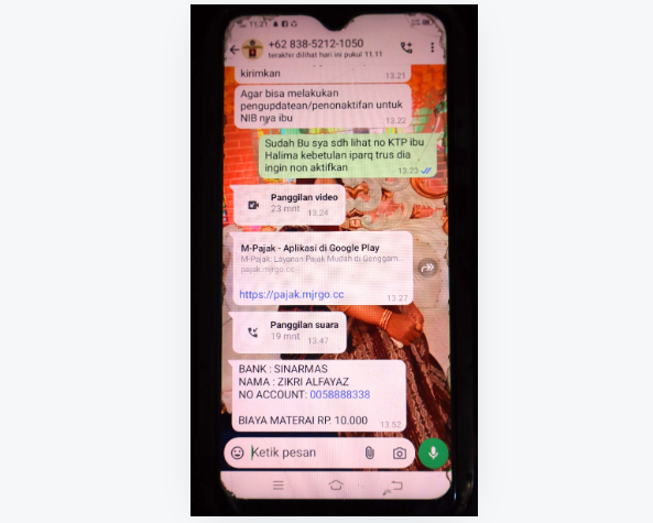 “Saya kemarin sempat video call dengan oknum tersebut dan diperlihatkan tutorial perubahan data melalui link aplikasi M-Pajak yang disampaikan pelaku. Di akhir telepon, oknum pelaku tersebut meminta biaya sebesar 10 ribu rupiah,” kata SP menceritakan kronologi penipuan yang dialaminya.