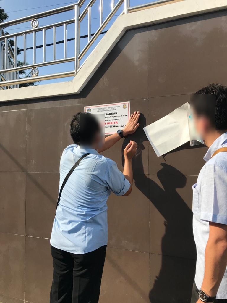 Penyidik memasang segel sita di beberapa titik antara lain, di depan pintu gerbang, di tembok bagian luar, dan di tembok bagian dalam bangunan yang disita.