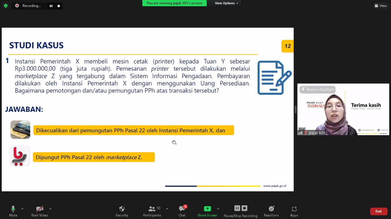 Kantor Pelayanan Pajak (KPP) Pratama Semarang Barat mengadakan sosialisasi terkait dengan Peraturan Menteri Keuangan (PMK) Nomor 58/PMK.03/2022 dan PMK Nomor 59/PMK.03/2022 dihadiri 47 wajib pajak melalui Apikasi Zoom Meeting di Semarang (Jumat, 13/5).