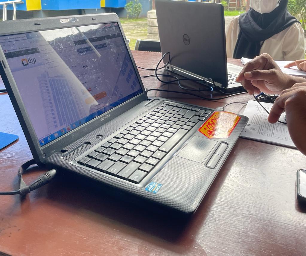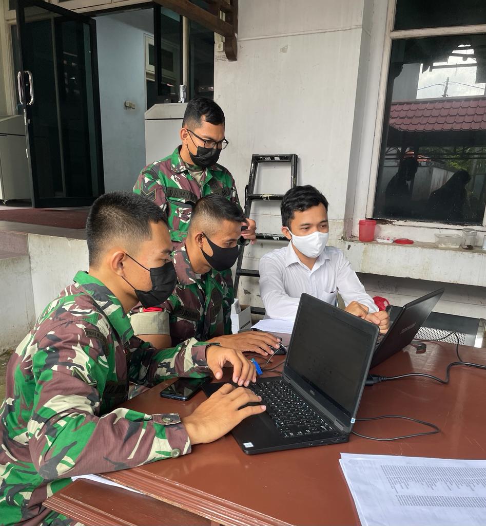 Asisten Penyuluh Pajak Kantor Pelayanan Pajak (KPP) Pratama Singkawang, Shalahudin Saesar, memberikan asistensi pelaporan Surat Pemberitahuan Tahunan Pajak Penghasilan Orang Pribadi melalui e-Filing kepada personel TNI Rindam XII Tanjungpura Kota Singkawang di halaman belakang KPP Pratama Singkawang (Senin, 24/1).