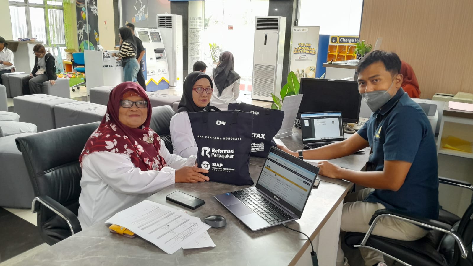 Penyuluh Pajak Kantor Pelayanan Pajak (KPP) Pratama Wonosari Dior Panji Putra Negara dan Jainal Abidin memandu dua Guru Kelompok Bermain untuk mempelajari sistem Coretax di Tempat Pelayanan Terpadu (TPT) KPP Pratama Wonosari, Kabupaten Gunungkidul (Rabu, 4/12).
