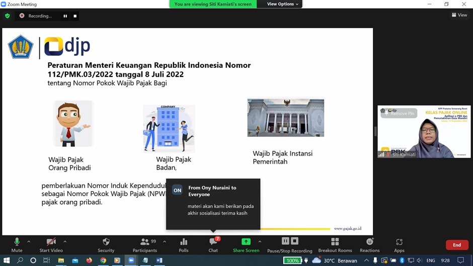 Penyuluh Kantor Pelayanan Pajak (KPP) Pratama Semarang Barat mengadakan sosialisasi terkait aplikasi e-Pbk dan pemutakhiran data mandiri wajib pajak secara daring yang diikuti oleh 98 Wajib Pajak Badan dan instansi pemerintah di Aula KPP Pratama Semarang Barat (Kamis, 17/11).