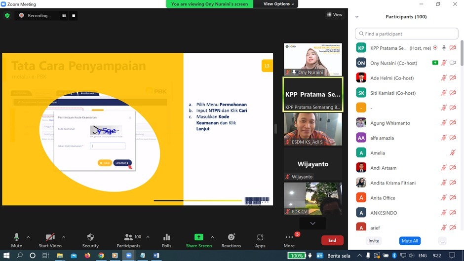 Ony Nuraini selaku Penyuluh Pajak menyampaikan bahwa penggunaan e-Pbk ini masih diterapkan secara terbatas di beberapa KPP, di antaranya adalah KPP Pratama Semarang Barat. Dalam sosialisasi ini dijelaskan terkait tata cara pengajuan pemindahbukuan (Pbk) yang dapat dilakukan secara online pada menu layanan e-Pbk di laman djponline.pajak.go.id.