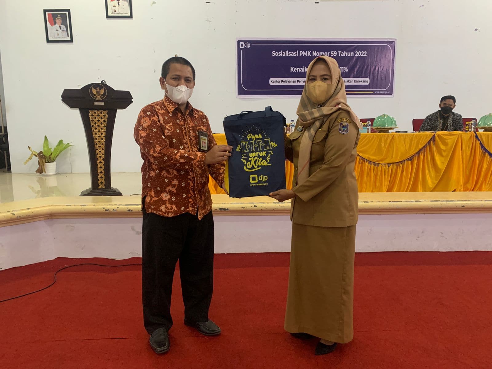 Kantor Pelayanan, Penyuluhan, dan Konsultasi Perpajakan (KP2KP) Enrekang bekerja sama dengan Instansi Pemerintah Pusat wilayah Kabupaten Enrekang mengadakan kegiatan sosialiasi tentang Peraturan Menteri Keuangan (PMK) Nomor 59/PMK.03/2020 Tahun 2022 (Selasa, 31/05). Kegiatan ini dilaksanakan di Aula Gedung Kantor Bupati Enrekang, Kabupaten Enrekang.