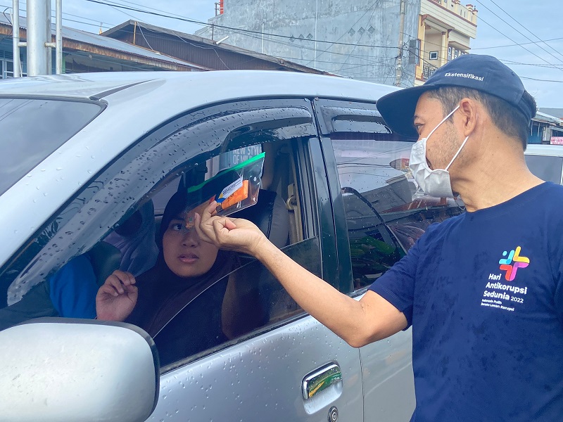 Hari Antikorupsi Sedunia diperingati setiap tanggal 9 Desember dan tahun ini bertemakan “Integritas Tangguh, Pulih Bertumbuh”. Pegawai KPP Pratama Majene menggelar aksi kampanye simpatik dengan membagikan coklat yang telah dilabeli “Hari Antikorupsi Sedunia” dan suvenir, berupa masker medis, pada masyarakat yang melintasi jalan poros Majene-Mamuju.