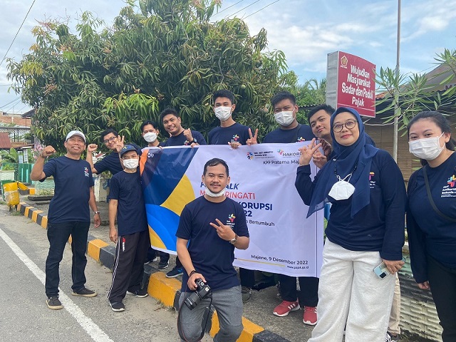 Kantor Pelayanan Pajak (KPP) Pratama Majene menggelar acara Fun Walk dalam rangka memperingati Hari Antikorupsi Sedunia (Hakordia) di Jalan Poros Majene-Mamuju (Jumat, 9/12). Kepala KPP Pratama Majene, bersama dengan pegawai KPP Pratama Majene, melakukan fun walk dan kampanye simpatik secara bersama-sama.
