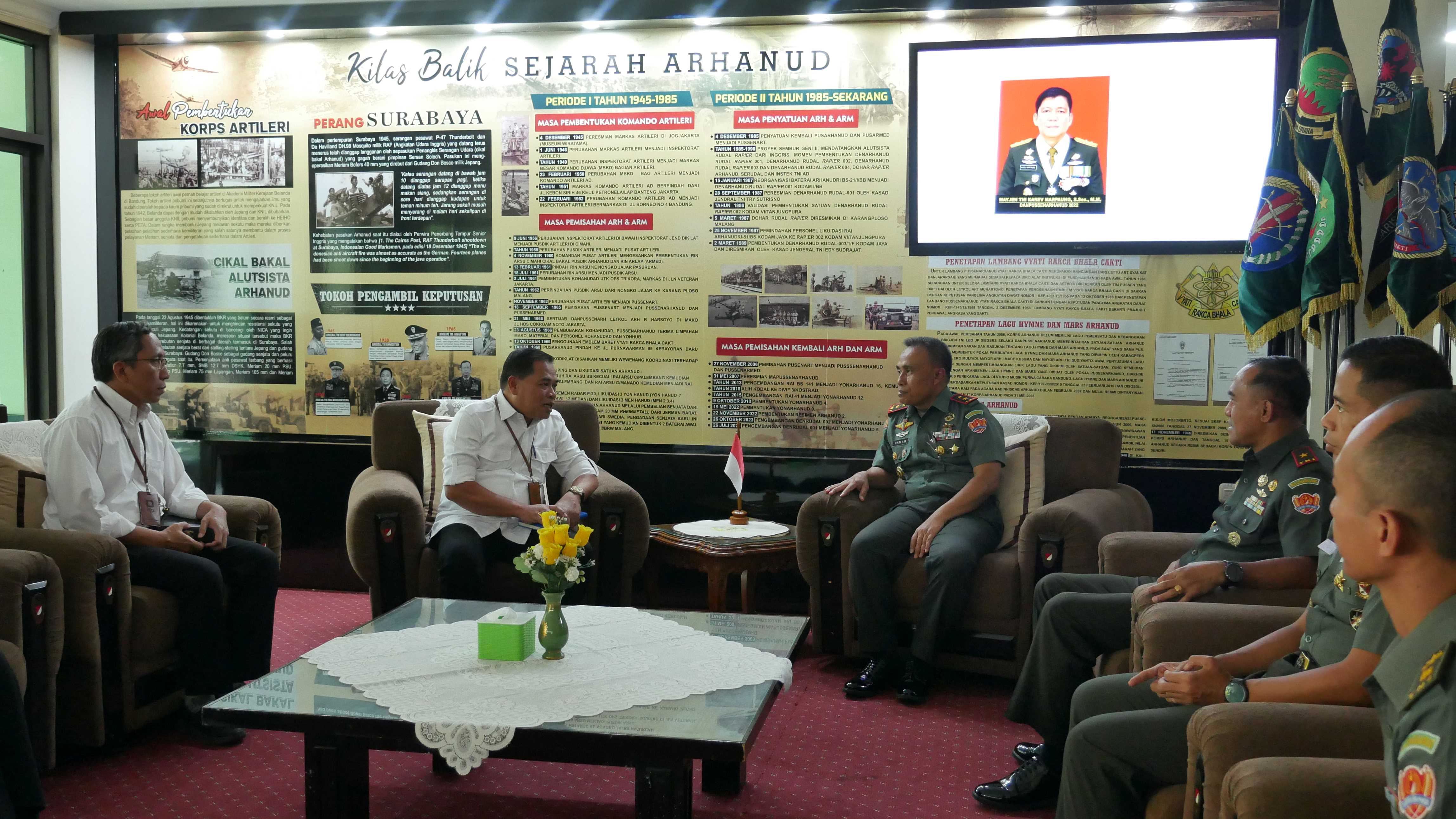 Komandan Pusat Kesenjataan Artileri Pertahanan Udara (Pussenarhanud) Mayor Jenderal (Mayjen) TNI Hari Arif Wibowo menerima kunjungan kerja dari Kantor Pelayanan Pajak (KPP) Pratama Cimahi di Markas Komando Pussenarhanud, Jl. Sriwijaya Raya No. 1, Kecamatan Cimahi Tengah, Kota Cimahi, Jawa Barat (Kamis, 3/10).