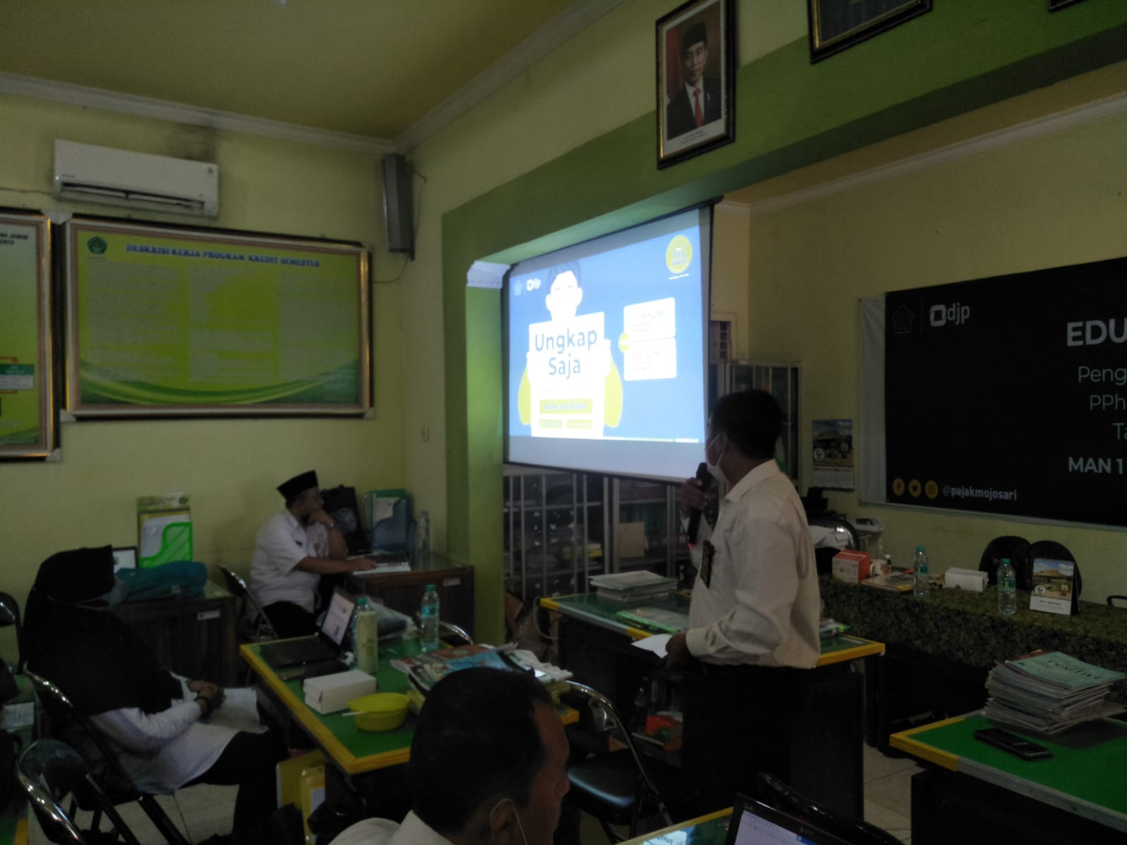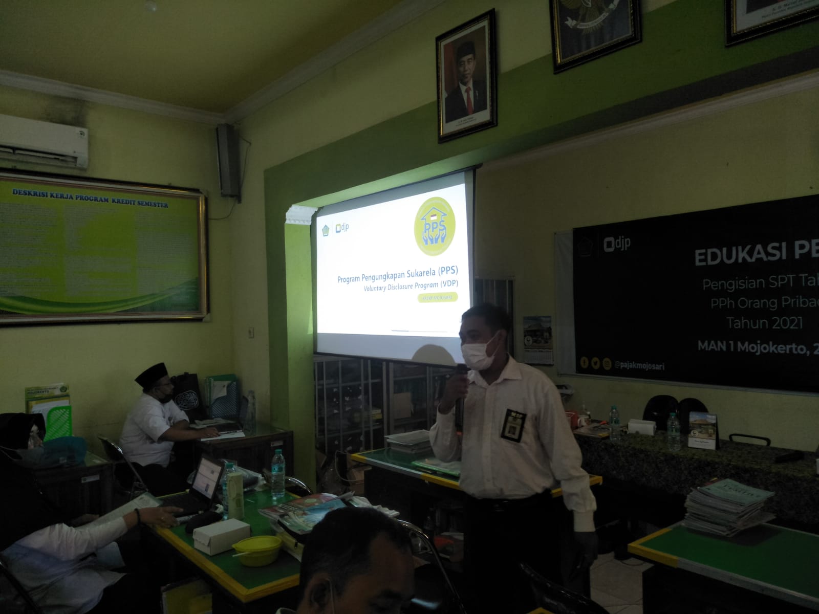 Kantor Pelayanan Penyuluhan dan Konsultasi perpajakan (KP2KP) Mojosari melakukan edukasi perpajakan dalam rangka memperluas informasi Program Pengungkapan Sukarela (PPS), bertempat di Ruang Guru MAN 1 Mojokerto (Senin, 24/1). Kepala KP2KP Mojosari Rahmat Basuki memberikan sambutan pada acara yang diikuti puluhan guru MAN 1 Mojokerto tersebut.