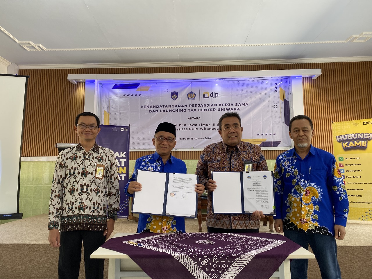 Direktorat Jenderal Pajak (DJP) melalui Kantor Wilayah (Kanwil) DJP Jawa Timur III meresmikan Tax Center di Universitas Persatuan Guru Republik Indonesia (PGRI) Wiranegara (Uniwara) Pasuruan, Jawa Timur (Selasa, 13/8). Peresmian Tax Center tersebut menambah jumlah Tax Center yang tersebar di berbagai universitas di wilayah kerja Kanwil DJP Jawa Timur III menjadi 26 Tax Center.