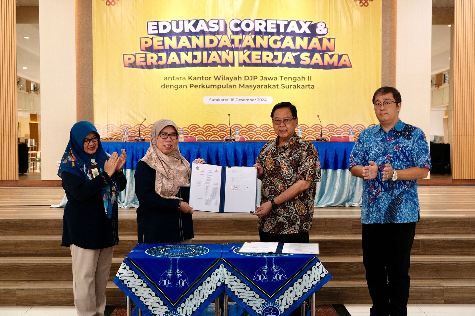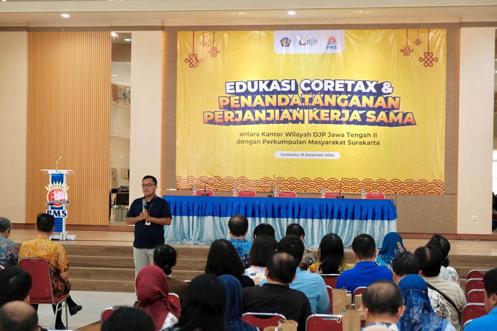 Kantor Wilayah Direktorat Jenderal Pajak (Kanwil DJP) Jawa Tengah II kembali memperpanjang kerja sama dengan Perkumpulan Masyarakat Surakarta (PMS) melalui penandatanganan perjanjian kerja sama dan edukasi Coretax yang berlangsung di Gedung Pertemuan PMS Surakarta, Kota Surakarta (Rabu, 18/12). Acara ini dihadiri sekitar 200 pengusaha dan masyarakat Surakarta.