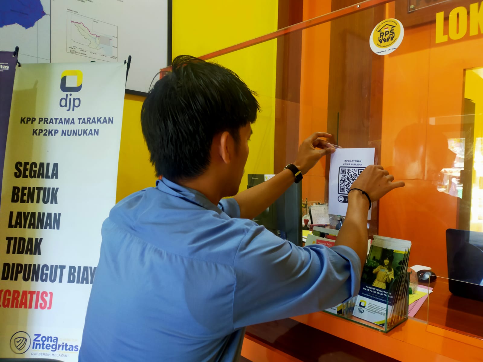 Petugas Kantor Pelayanan Penyuluhan dan Konsultasi Perpajakan (KP2KP) Nunukan yang sedang bertugas di Pulau Sebatik melakukan pemasangan barcode di loket Tempat Pelayanan Terpadu (TPT) Pos Pelayanan Perpajakan Pulau Sebatik, Kab. Nunukan (Rabu, 29/6). Barcode tersebut berisi informasi tentang berbagai jenis layanan yang disediakan oleh oleh KP2KP Nunukan mulai dari pendaftaran Nomor Pokok Wajib Pajak (NPWP), pembuatan kode billing, pelaporan Surat Pemberitahuan (SPT) Tahunan, konsultasi umum, dan kumpulan materi penyuluhan.
