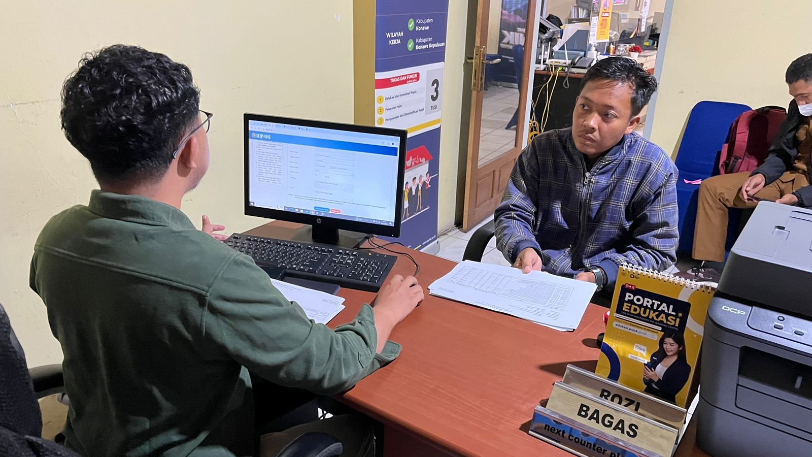 Kantor Pelayanan, Penyuluhan, dan Konsultasi Perpajakan (KP2KP) Unaaha menerima kunjungan satu wajib pajak instansi pemerintah di lingkungan Kabupaten Konawe, di Tempat Pelayanan Terpadu (TPT) KP2KP Unaaha Jalan Diponegoro, Kelurahan Tuoy, Kecamatan Unaaha, Kabupaten Konawe (Selasa, 26/11). Kunjungan wajib pajak instansi pemerintah ini diterima oleh Petugas KP2KP Unaaha Satriawan yang akan memberikan layanan maupun edukasi kepada wajib pajak.