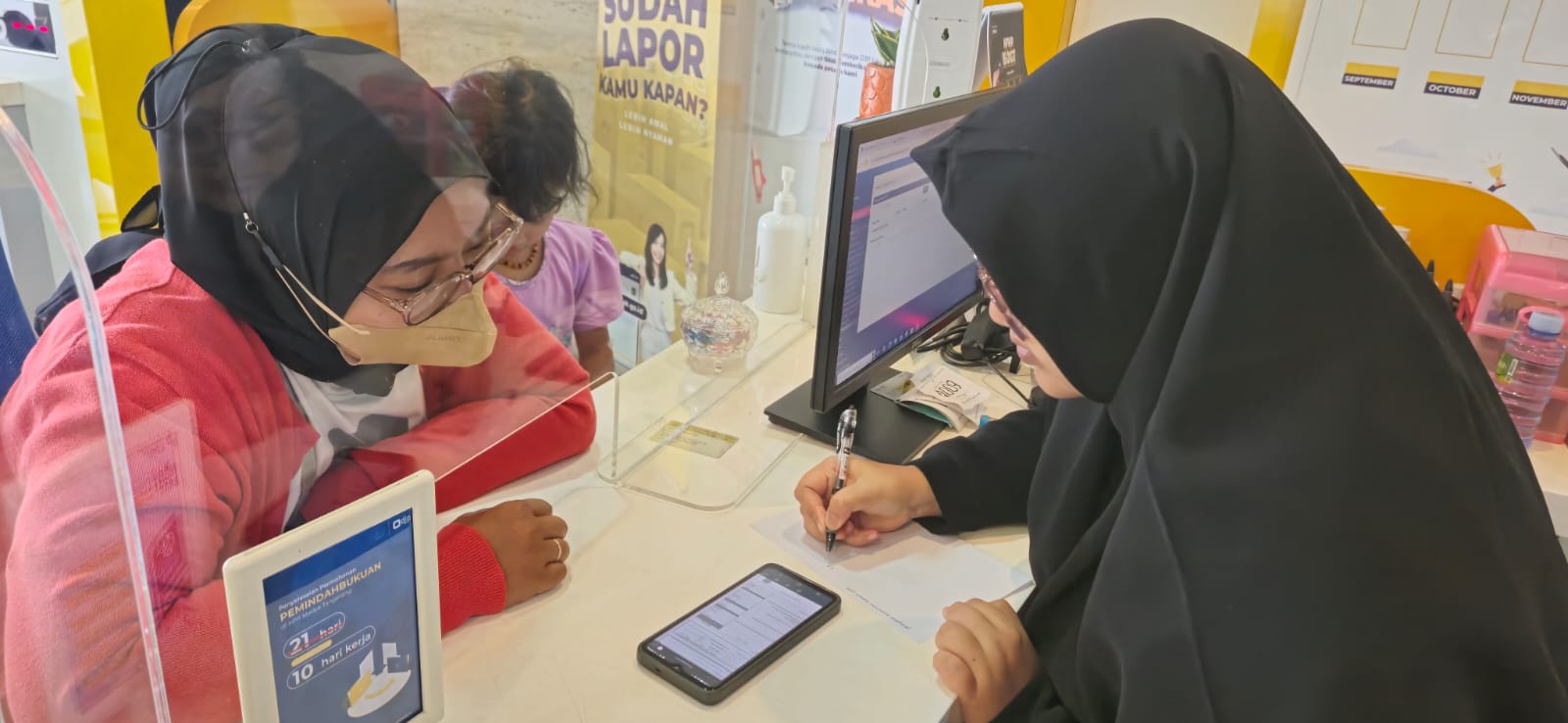 Petugas pajak mendampingi Wajib Pajak Orang Pribadi yang akan melaporkan Surat Pemberitahuan (SPT) Tahunan di Loket Tempat Pelayanan Terbaru (TPT) Kantor Pelayanan Pajak (KPP) Madya Tangerang, Jalan Jalur Sutera Barat No. 3, Panunggangan Timur, Pinang, Kota Tangerang, Banten (Selasa, 11/2).