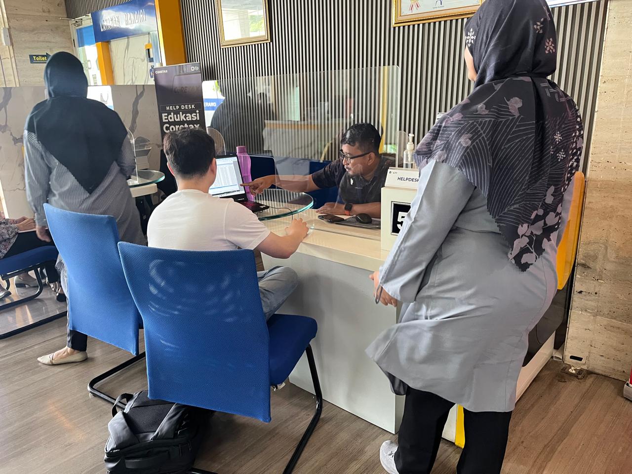 Tosa, Petugas Helpdesk Kantor Pelayanan Pajak (KPP) Madya Tangerang, memberikan konsultasi kepada seorang karyawan Wajib Pajak Badan Usaha di Loket Helpdesk KPP Madya Tangerang, Gedung Menara Top Food, Jalan Jalur Sutera Barat No. 3, Panunggangan Timur, Pinang, Kota Tangerang, Banten (Kamis,30/1).