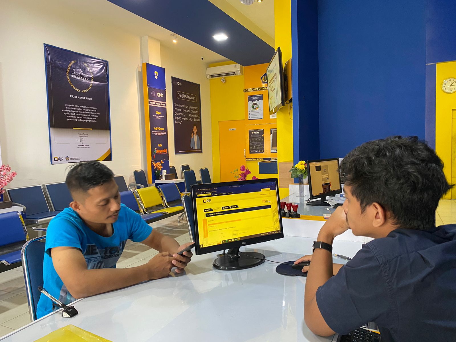 Salah seorang wajib pajak melakukan konsultasi mengenai pelaporan pajak Surat Pemberitahuan Tahunan (SPT) Badan dengan Petugas Penyuluh Kantor Pelayanan, Penyuluhan, dan Konsultasi Perpajakan (KP2KP) Nanga Pinoh di ruang tempat pelayanan terpadu (TPT) KP2KP Nanga Pinoh, Kabupaten Melawi (Selasa, 30/7). Ada satu wajib pajak yang datang ke kantor pajak untuk melaporkan SPT Tahunan badan.