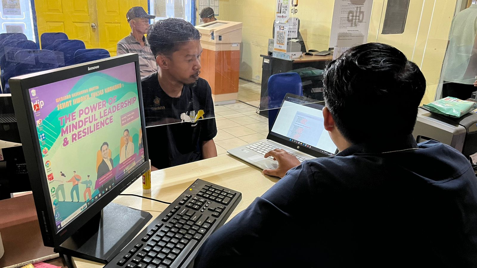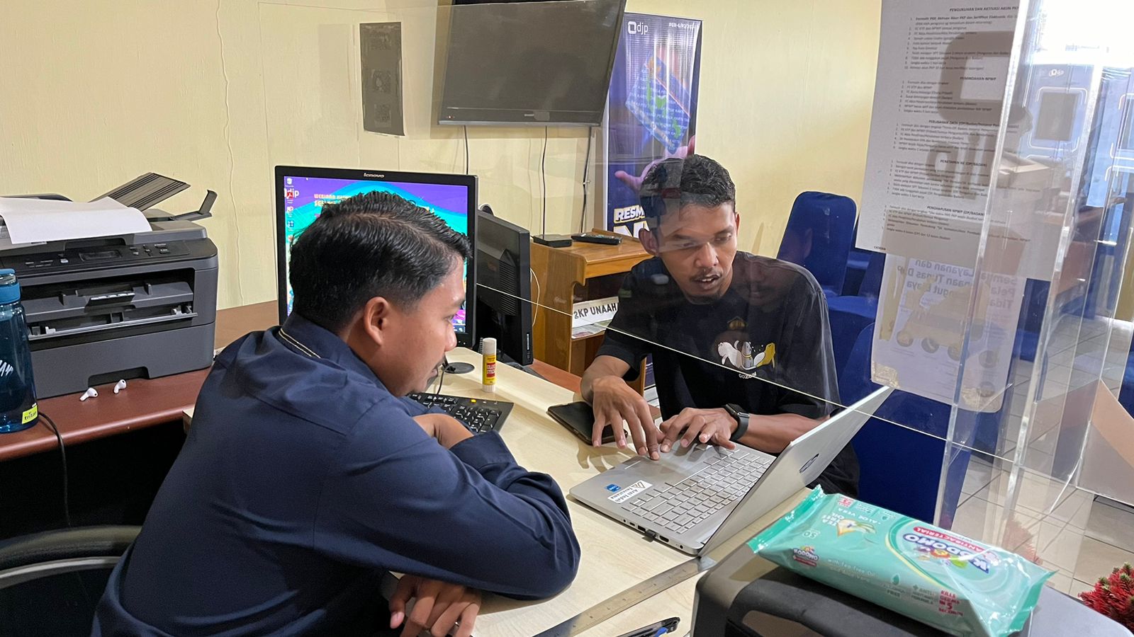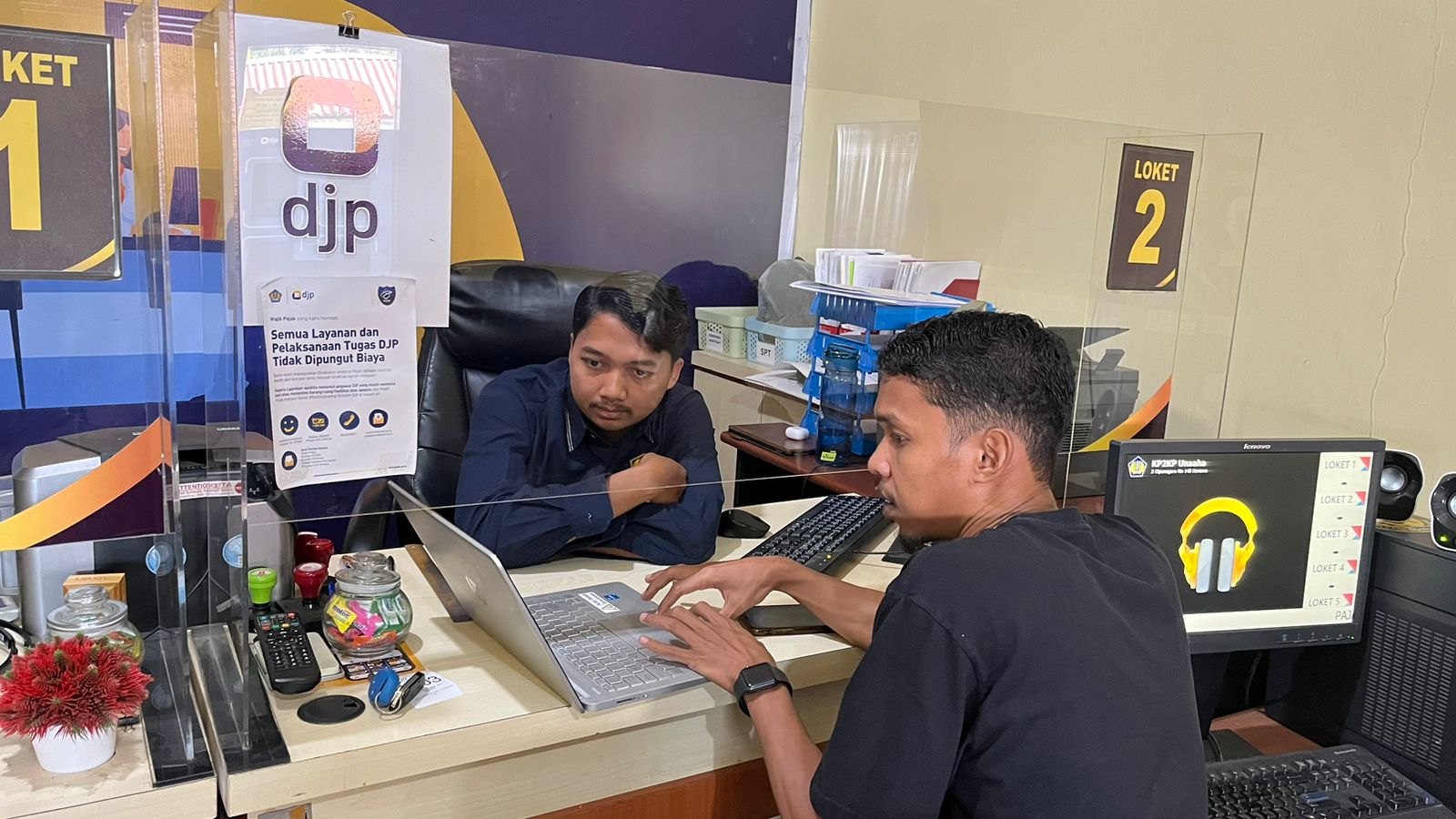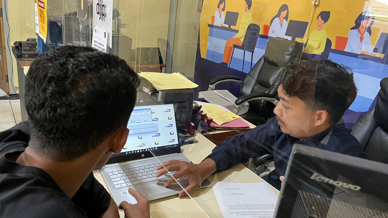 Petugas Kantor Pelayanan, Penyuluhan, dan Konsultasi Perpajakan (KP2KP) Unaaha Kharisma yang sedang melaksanakan kegiatan piket helpdesk dan juga layanan, memberikan edukasi perpajakan (terkait pemasangan sertifikat elektronik) yang dilakukan secara langsung tatap muka kepada satu Wajib Pajak Badan yang baru berstatus sebagai Pengusaha Kena Pajak (PKP), AII, yang melakukan konsultasi di Tempat Pelayanan Terpadu (TPT) KP2KP Unaaha, Jalan Diponegoro, Kabupaten Konawe (Rabu, 6/11).