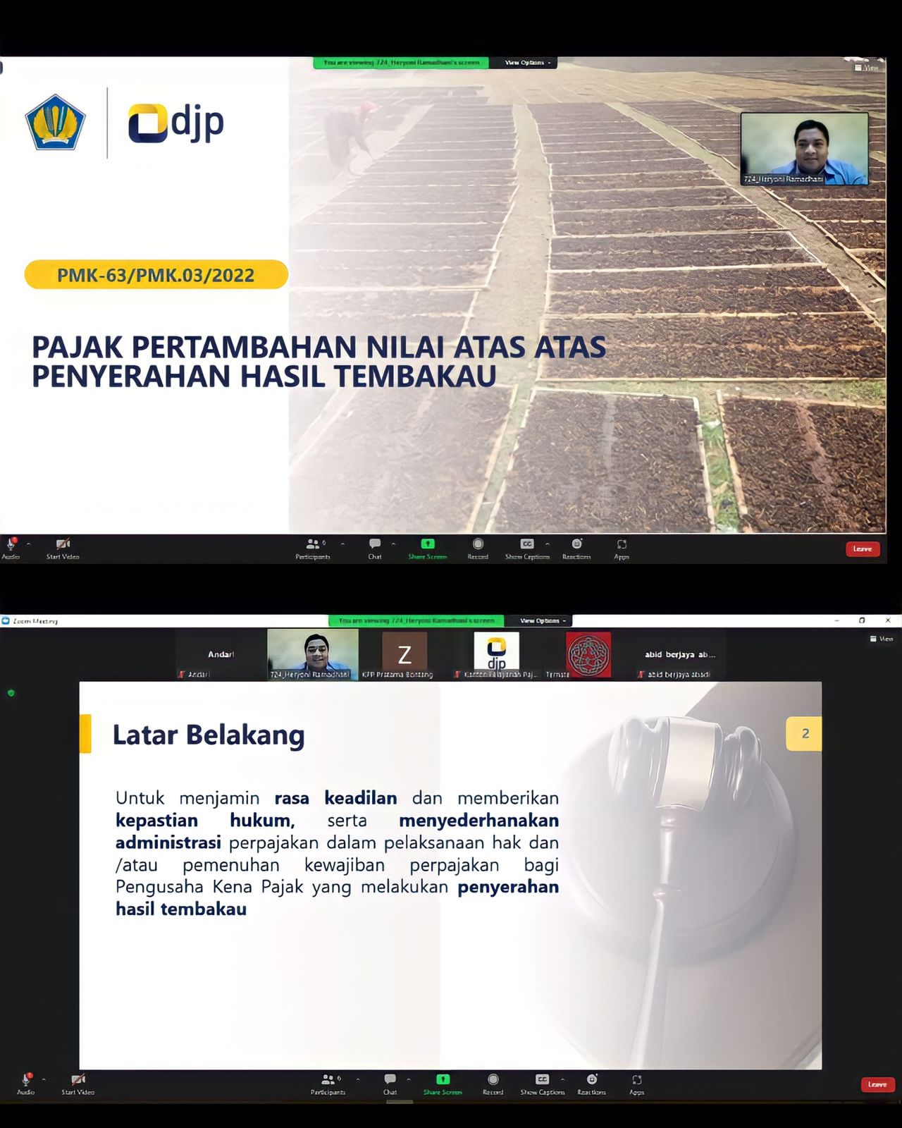 Kantor Pelayanan Pajak (KPP) Pratama Bontang menyelenggarakan kegiatan Kelas Pajak secara daring terkait Peraturan Menteri Keuangan Nomor 63/PMK.03/2022 tentang Pajak Pertambahan Nilai (PPN) atas penyerahan hasil tembakau di Kota Bontang (Kamis, 24/11).