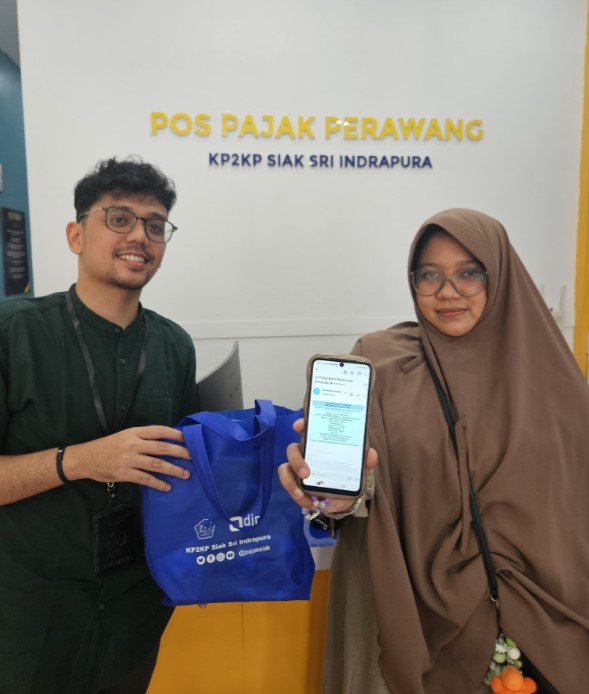 Pos Pelayanan Pajak Perawang memberikan apresiasi kepada wajib pajak pertama yang mengajukan asistensi dalam melaporkan Surat Pemberitahuan (SPT) Tahunan 2024 di Pos Pelayanan Pajak Perawang, Kabupaten Siak (Kamis, 2/1).