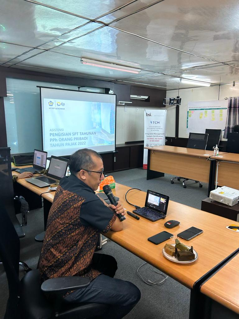 Andry Hermansyah selaku Kepala KP2KP Sendawar menjelaskan materi terkait perhitungan PPh Pasal 21, pemadananan Nomor Induk Kependudukan (NIK)-Nomor Pokok Wajib Pajak (NPWP), dan juga Tata Cara Pelaporan Surat Pemberitahuan (SPT) Tahunan bagi Karyawan Swasta.