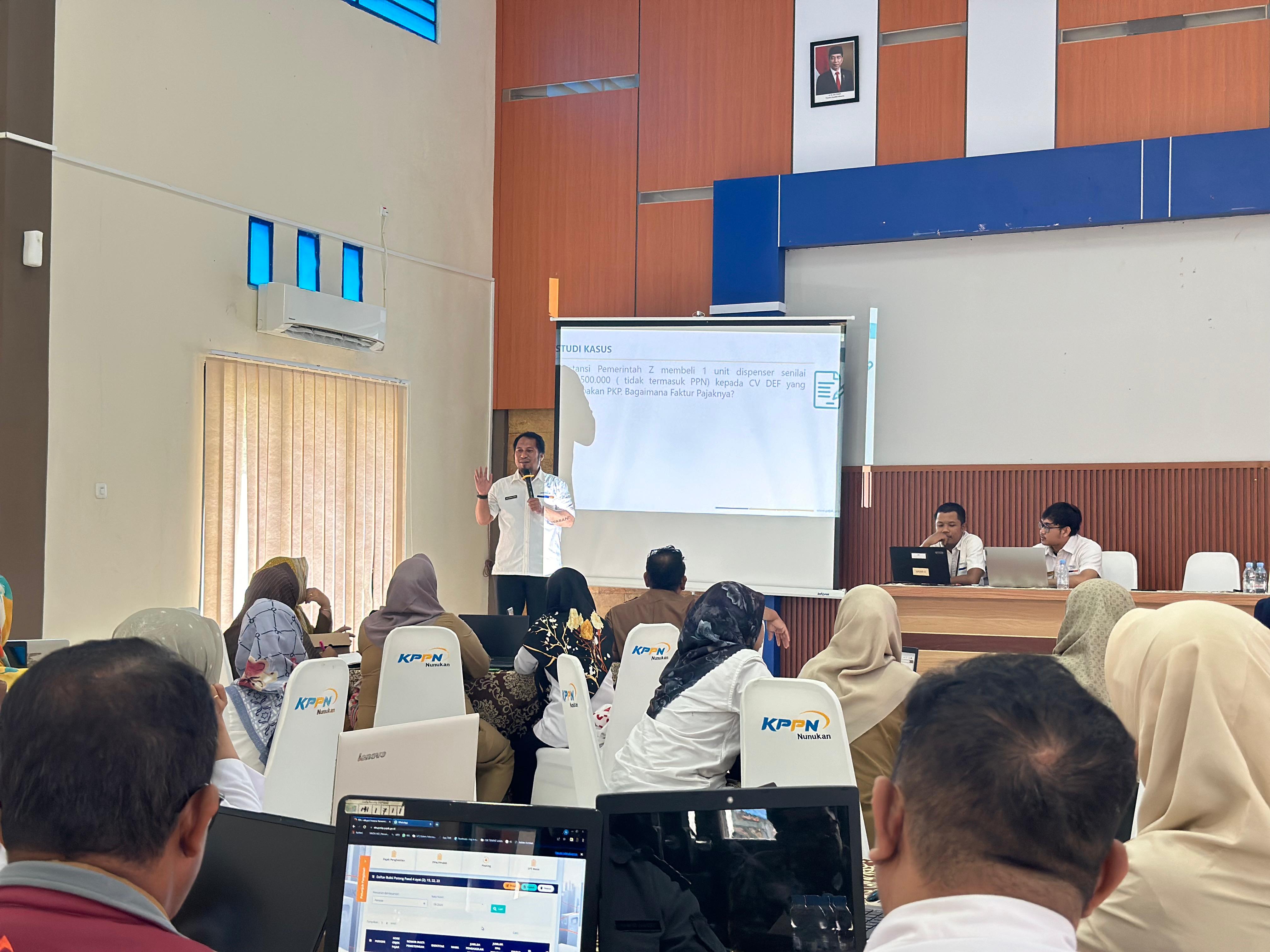 Kantor Pelayanan, Penyuluhan, dan Konsultasi Perpajakan (KP2KP) Nunukan menyelenggarakan Bimbingan Teknis (Bimtek) SPT Masa Unifikasi yang bertempat di aula Kantor Pelayanan Perbendaharaan Negara (KPPN) Nunukan, Kab. Nunukan (Senin, 26/8). Kegiatan ini dihadiri oleh bendahara dan operator dari 27 Organisasi Perangkat Daerah (OPD) di Pemerintah Kabupaten Nunukan.
