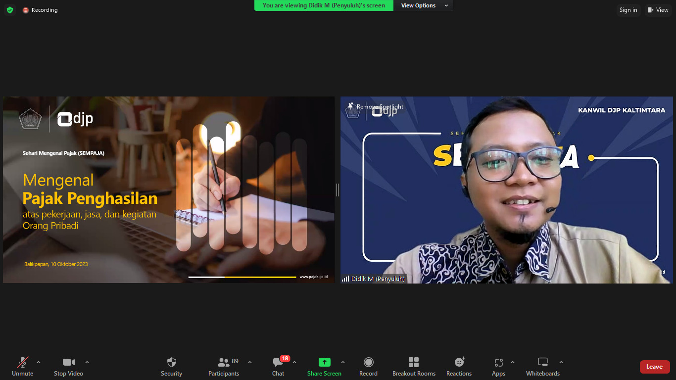 Bekerja sama dengan Tax Center Sekolah Tinggi Ilmu Ekonomi (STIE) Widya Praja Tanah Grogot, Kantor Wilayah Direktorat Jenderal Pajak Kalimantan Timur dan Utara (Kanwil DJP Kaltimtara) menyelenggarakan kelas pajak. Kelas pajak bertajuk Sehari Mengenal Pajak (SEMPAJA) diikuti oleh puluhan mahasiswa STIE Widya Praja Tanah Grogot secara daring (Selasa, 10/10). Didik Musthafa, Penyuluh Pajak Kanwil DJP Kaltimtara menyampaikan materi pengenaan pajak penghasilan bagi orang pribadi kepada para peserta.