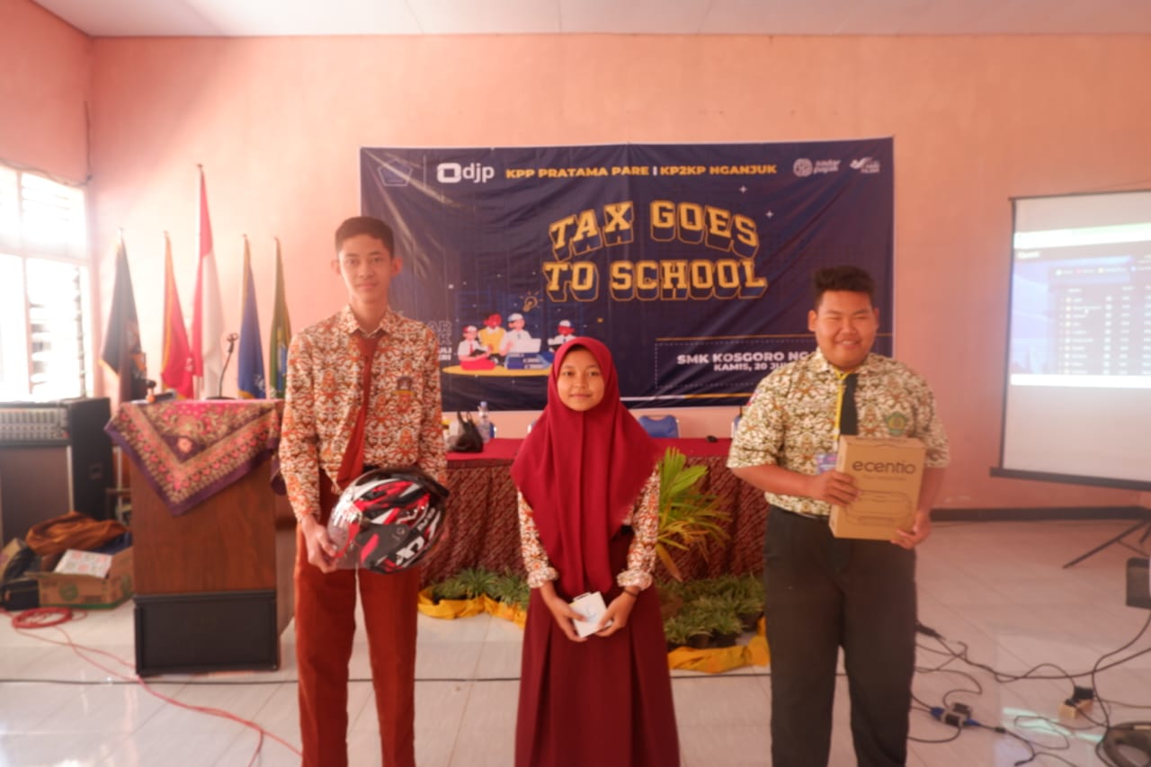 Kantor Pelayanan Pajak (KPP) Pratama Pare bekerja sama dengan Kantor Pelayanan, Penyuluhan, dan Konsultasi Perpajakan (KP2KP) Nganjuk menggelar kegiatan Tax Goes to School (TGTS) di Aula Sekolah Menengah Kejuruan (SMK) Kosgoro, Nganjuk, Jawa Timur (Kamis, 20/7). Kegiatan yang bertemakan “Muda Berkreasi Membangun Negeri” ini diikuti oleh puluhan Siswa SMK Kosgoro Nganjuk.