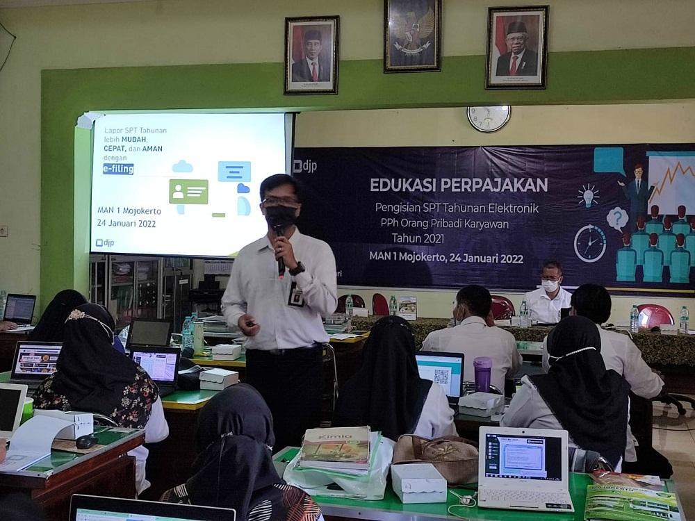 Kantor Pelayanan Penyuluhan dan Konsultasi perpajakan (KP2KP) Mojosari melakukan edukasi perpajakan dan bimbingan teknis terkait pengisian SPT Tahunan PPh Orang Pribadi Karyawan secara elektronik melalui e-Filing bertempat di MAN 1 Mojokerto (Senin, 24/1). Kepala KP2KP Mojosari Rahmat Basuki memberikan sambutan pada acara yang diikuti oleh lebih dari 30 pendidik MAN 1.