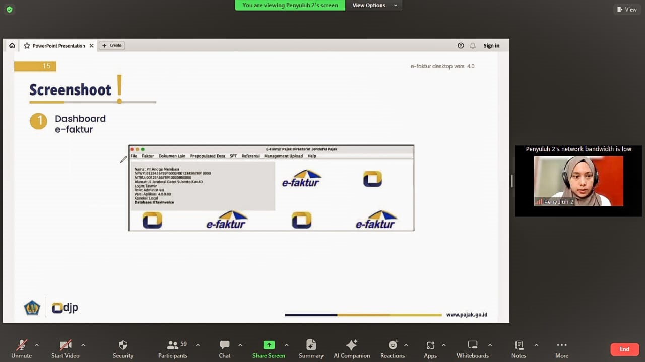 Materi sosialisasi disampaikan oleh Fungsional Asisten Penyuluh Pajak Mahir, Muamaroh Husnantiya, dan Fungsional Asisten Penyuluh Pajak Terampil, Adani Andono Putri. “Secara umum, menu dalam e-Faktur versi 4.0 masih sama dengan versi 3.2. Namun ada beberapa penyesuaian yang dilakukan. Salah satu penyesuaiannya adalah wajib pajak dapat melakukan perekaman NPWP 16 digit dan 15 digit saat membuat faktur pajak, baik pada versi web maupun desktop. Selain itu, terdapat penambahan informasi NITKU dalam output beberapa dokumen, seperti cetakan faktur dan retur pajak. Wajib Pajak juga dapat masuk ke website e-Nofa menggunakan NPWP 15 dan 16 digit,” ujar Muamaroh.