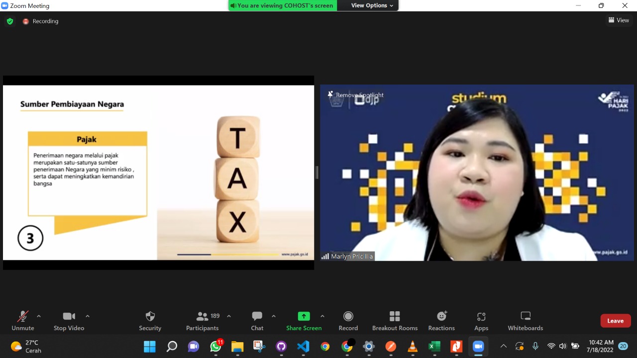 Di hadapan ratusan peserta daring, Marlyn Priscillia Laluyan, Penyuluh Pajak Kanwil DJP Kaltimtara berkesempatan memberikan edukasi ringan tentang Hari Pajak dan materi perpajakan lainnya. Satu jam berlangsung, Marlyn bicara banyak tentang bagaimana pandemi Covid-19 mempengaruhi perekomian Indonesia dan bagaimana pajak tetap hadir menyokong jalannya perekonomian masyarakat.