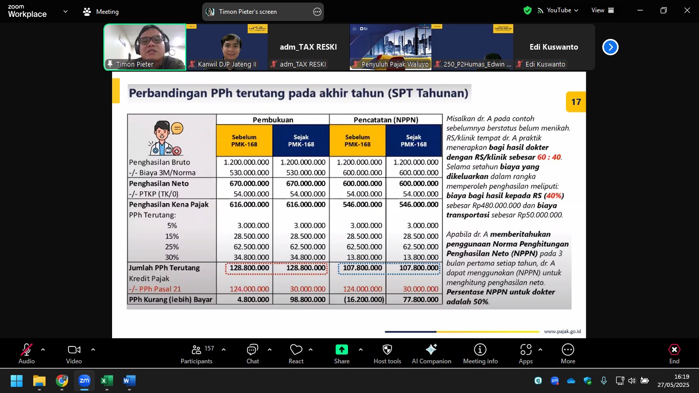 Sebagai pekerja bebas, dokter memiliki karakteristik penghasilan yang berbeda. Penyuluh Pajak, Timon Pieter, selaku narasumber menjelaskan bahwa untuk dokter yang berpraktik sebagai pekerja bebas, penghitungan penghasilan neto dapat dilakukan dengan dua metode, yaitu pencatatan menggunakan Norma Penghitungan Penghasilan Neto (NPPN) atau pembukuan.