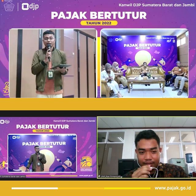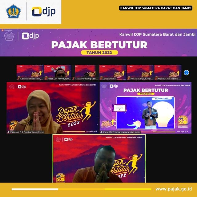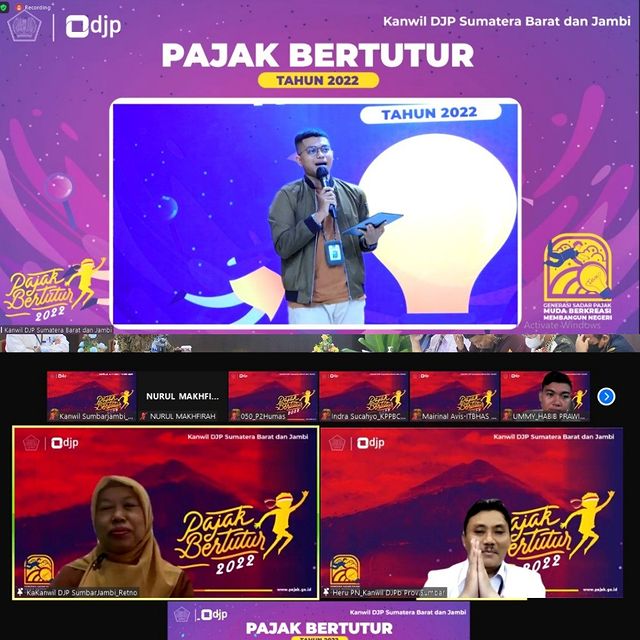Kanwil DJP Sumatera Barat dan Jambi mengadakan kegiatan Pajak Bertutur Tahun 2022 sebagai bagian dari Program Inklusi Kesadaran Pajak dalam rangka meningkatkan kesadaran pajak pada generasi muda secara daring, Kamis (18/08/2022).