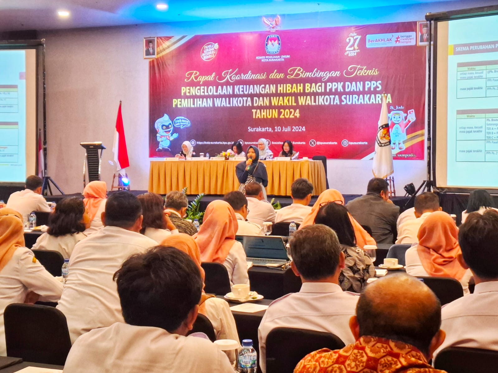 Kantor Pelayanan Pajak (KPP) Pratama Surakarta mengadakan Bimbingan Teknis pengelolaan keuangan hibah bagi Panitia Pemungutan Suara (PPS) dan Panitia Pemilihan Kecamatan (PPK) Pemilihan Walikota dan Wakil Walikota Surakarta Tahun 2024. Pemotongan Pajak Penghasilan (PPh) Pasal 21/26 terbaru berdasarkan Peraturan Pemerintah Nomor 58 Tahun 2023 di Paragon Convention Hall, Kota Surakarta (Rabu, 10/7).