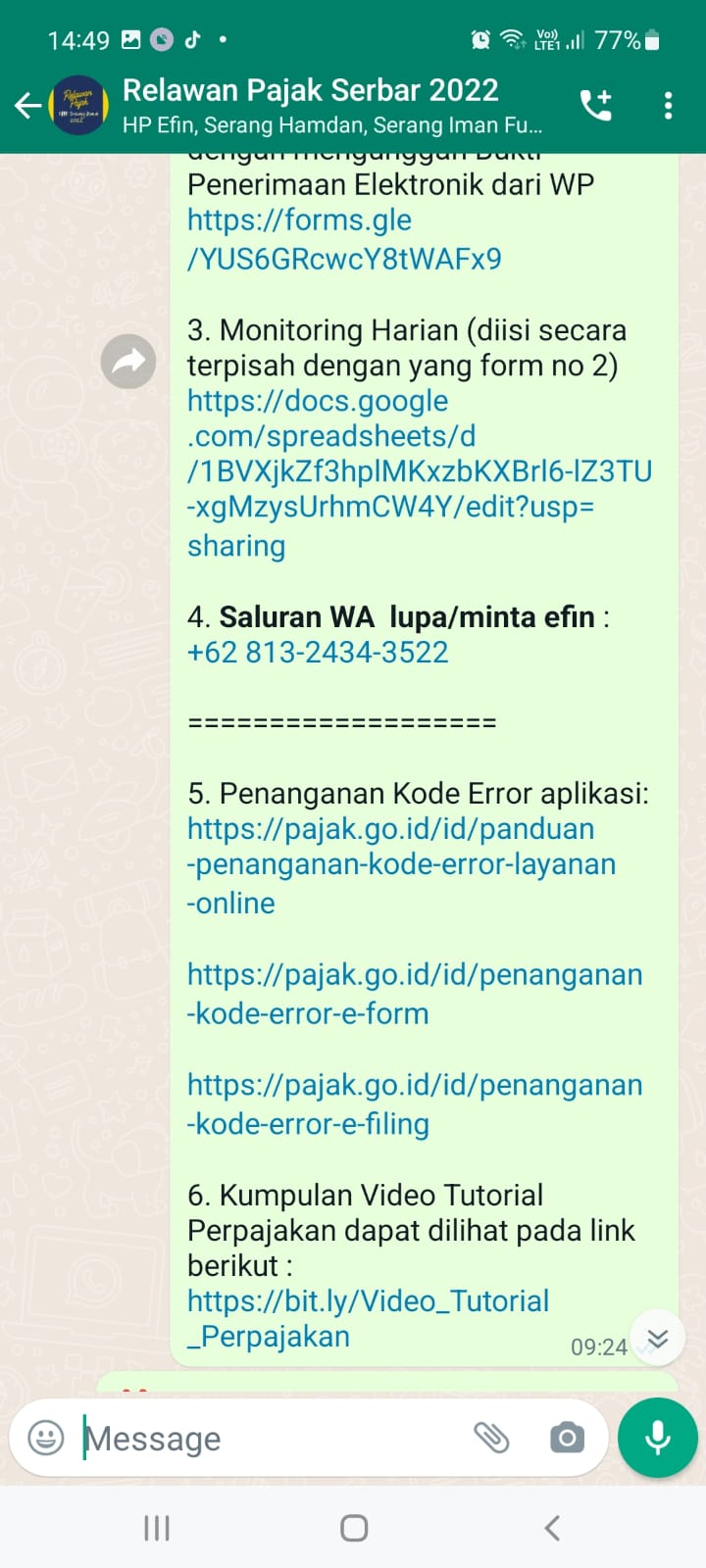 Hal lain yang dilakukan adalah membuat WhatsApp grup relawan yang disana di share atas alur asistensi, beberapa FAQ dari kode gangguan atas djponline serta kumpulan video tutorial terkait layanan online DJP. Hal ini dilakukan untuk lebih menjaga dan melindungi serta mengawasi Relawan Pajak atas hal-hal yang tidak diinginkan, sehingga kegiatan relawan pajak berjalan lebih lancar dan kepatuhan SPT Tahunan meningkat.