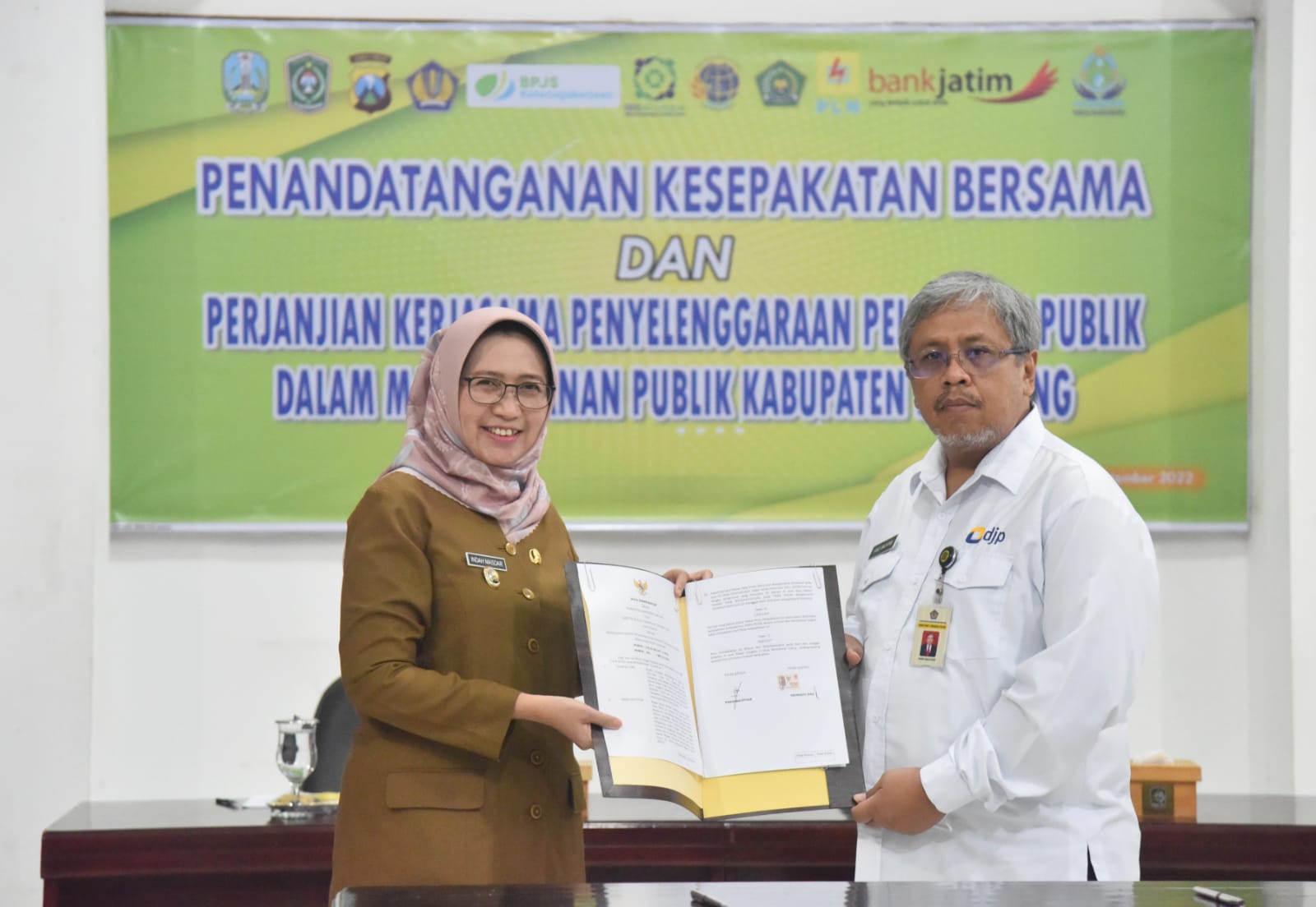 Wakil Bupati Lumajang Indah Amperawati Masdar bersama Kepala Kantor Wilayah Direktorat Jenderal Pajak (Kanwil DJP) Jawa Timur III Farid Bachtiar beserta 18 perwakilan unit penyelenggara layanan publik lainnya menandatangani Nota Kesepakatan Bersama dan Perjanjian Kerja Sama Penyelenggaraan Pelayanan Publik di Kabupaten Lumajang (Senin, 19/9).