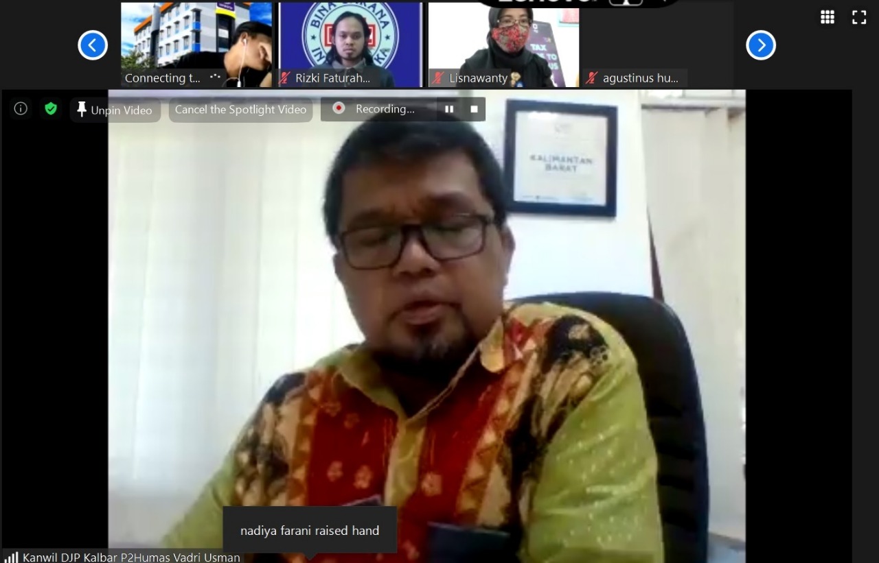 KPP Pratama Pontianak Timur mengadakan sosialisasi pajak kepada future tax payer melalui acara Tax Goes To Campus (TGTC) bersama mahasiswa Universitas Bina Sarana Informatika (UBSI) (Rabu, 26/8). Acara TGTC kali ini mengusung tema “Kamek Bangga Sadar Pajak”. Kegiatan yang dilakukan secara daring melalui Zoom Cloud Meeting dari ruang rapat KPP Pratama Pontianak Timur ini dihadiri oleh rektor UBSI, jajaran pimpinan kampus UBSI Pontianak, dan total 246 mahasiswa semester pertama UBSI.
