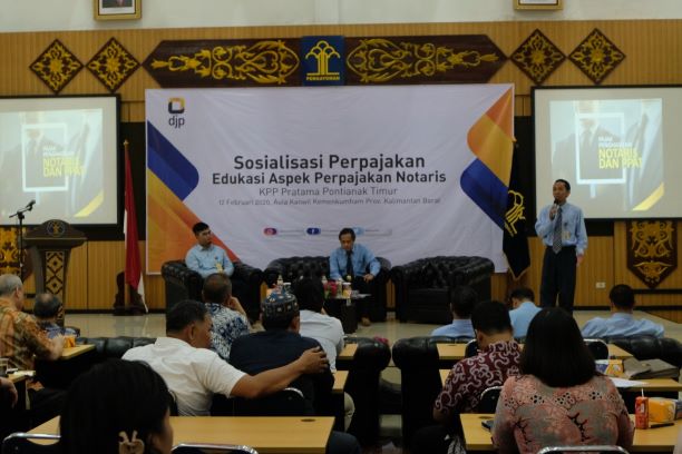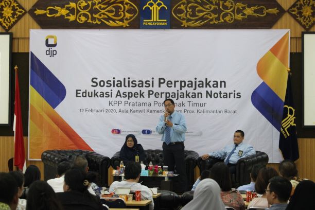 KPP Pratama Pontianak Timur menyelenggarakan sosialisasi perpajakan kepada Notaris di aula Kantor Kementerian Hukum dan HAM Provinsi Kalimantan Barat (Rabu, 12/2). Sosialisasi yang bertema Edukasi Aspek Perpajakan Notaris ini dihadiri oleh para Notaris se-kota Pontianak.