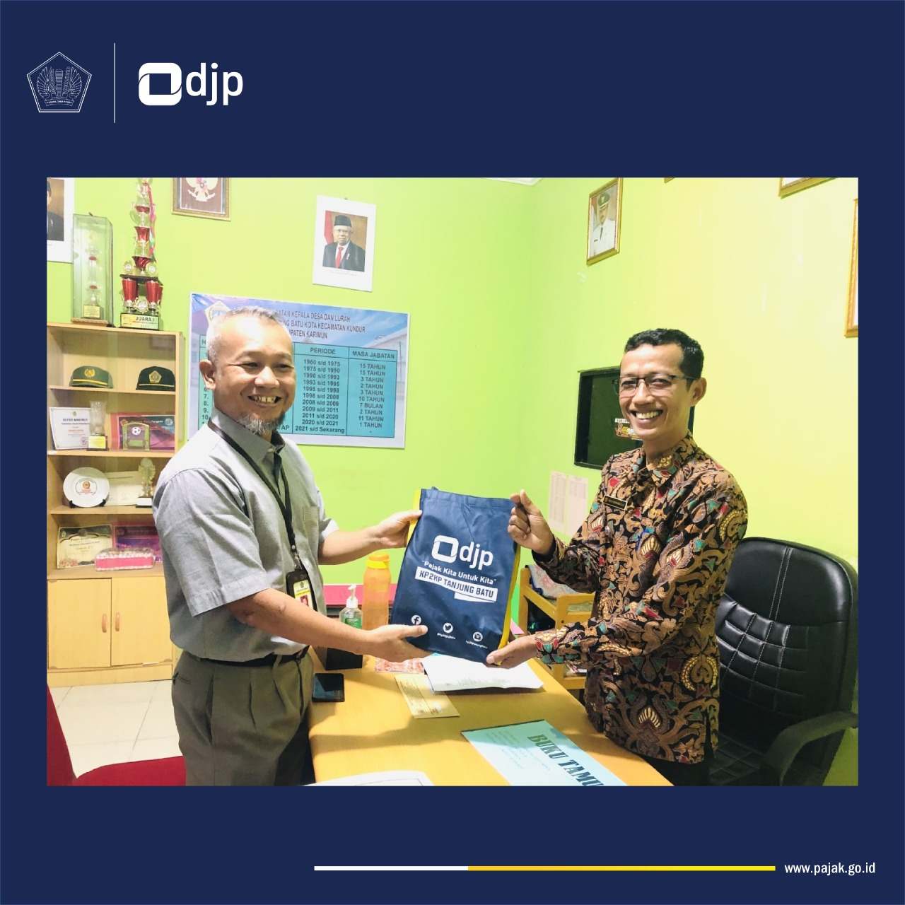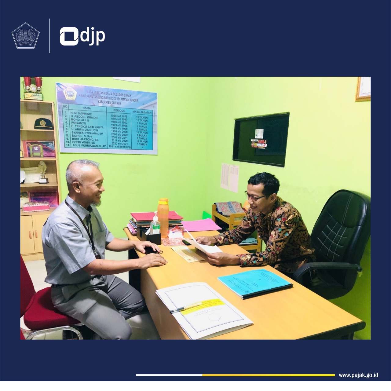 Kantor Pelayanan, Penyuluhan dan Konsultasi Perpajakan (KP2KP) Tanjung Batu melakukan koordinasi terkait kegiatan pemutakhiran data mandiri (PDM) dalam rangka implementasi Nomor Induk Kependudukan (NIK) sebagai Nomor Pokok Wajib Pajak (NPWP) dengan Lurah Kelurahan Tanjung Batu Kota, Kundur, Karimun, Kepulauan Riau (Kamis, 12/1).
